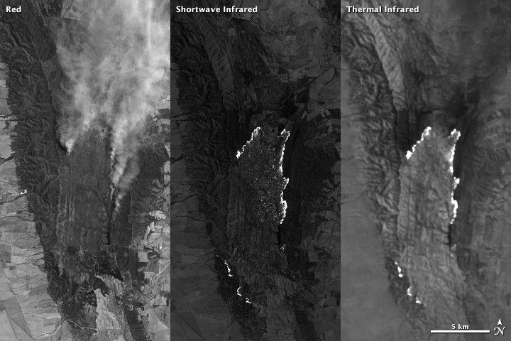 The Earth Observatory also uses thermal infrared measurements to show land temperatures, fire areas, or volcanic flows, but most of the time, these are published as grayscale images. Occasionally, the thermal features of interest will be layered on top of a true-color or grayscale image, particularly in the case of a fire or volcano.
