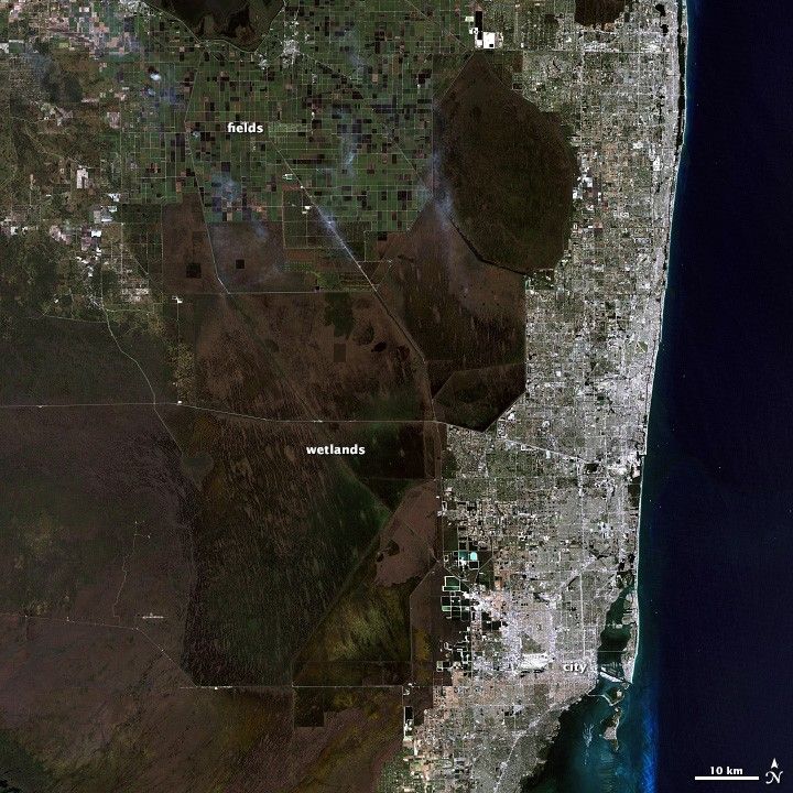 This false-color view also reveals how water flows through the Northern Everglades. Green islands punctuate the wetlands, which are black and blue. These are tree islands that are hard to distinguish in natural color. Their orientation aligns with the flow of the water, highlighting direction that is not obvious in the natural color image. It is also easier to see the extent of the wetlands against surrounding land, since water is dark in this view and plant-covered land is bright green.