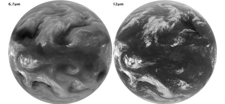 Mid-infrared (7µm) and thermal-infrared (12 µm) images showing water vapor (left), and temperature (right). The images are inverted to better show clouds: cold areas are light and warm areas are dark. (NASA/NOAA images by Robert Simmon, using data from the GOES Project Science Team.)