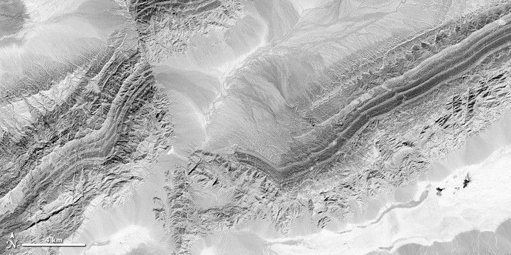 Variations in mineral content, vegetation, and water cause patterns of light and dark in this near infrared view of the Piqiang Fault in northwestern China. (NASA image by Robert Simmon with ASTER data.)