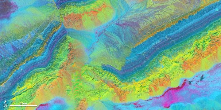 Comparing the differences between 3 shortwave infrared bands highlights the mineral geology surrounding China’s Piqiang Fault. (NASA image by Robert Simmon with ASTER data.)
