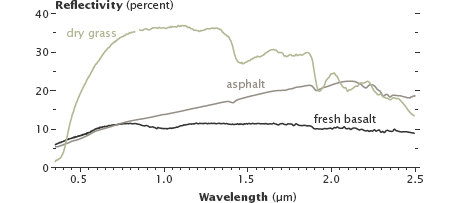 Varied land surfaces have distinct spectral signatures. Fresh basalt lava and asphalt reflect different amounts of infrared light, even though they appear similar in visible light. (Photograph ©2012 Robert Simmon. Figure by Robert Simmon, using data from the USGS Digital Spectral Library.)