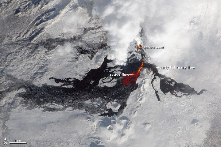 Infrared light reveals details of the evolving lava flows on Russia’s Tolbachik Volcano. (NASA image by Jesse Allen and Robert Simmon, using EO-1 ALI data from the NASA EO-1 team.)