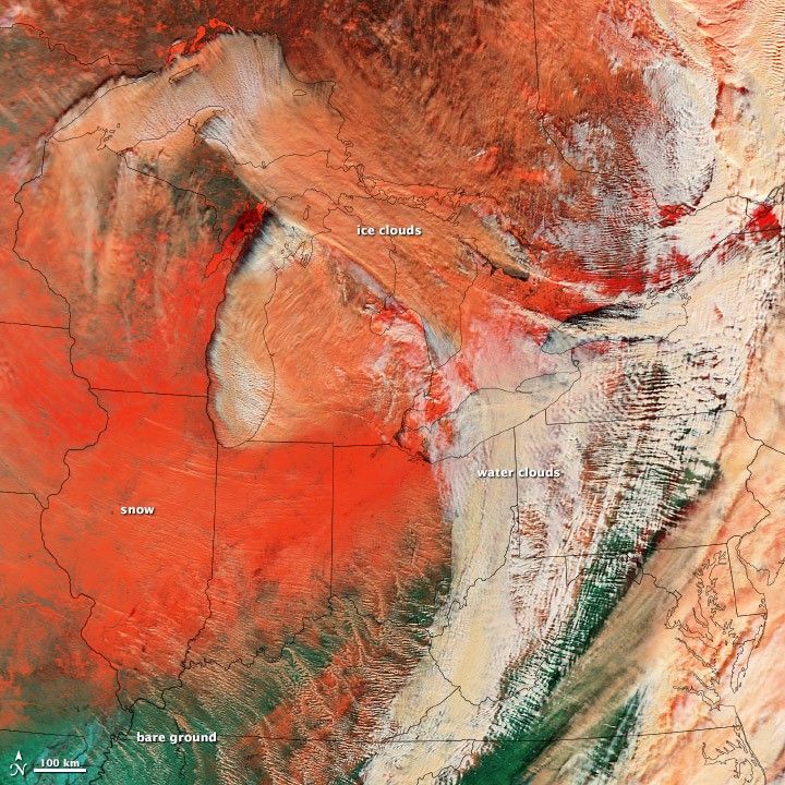 A combo of blue and shortwave infrared light contrasts clouds, snow, and ice in a large winter storm from January 2014. (NASA image by Jesse Allen and Robert Simmon; data from LANCE/EOSDIS Rapid Response.)