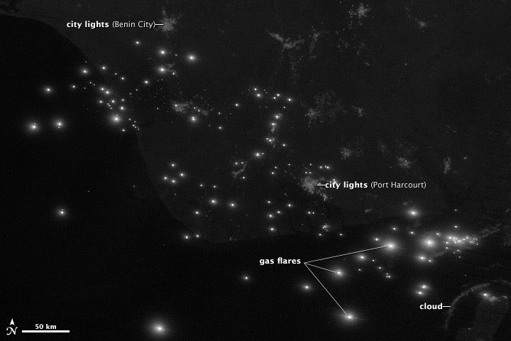 Visible light at night (top) shows cities, gas flares, and moonlight reflected off clouds. Flares also shine in midwave infrared (lower); this view also contrasts warm waters with colder land and clouds. (NASA/NOAA image by Jesse Allen and Robert Simmon, using VIIRS data from NGDC.)