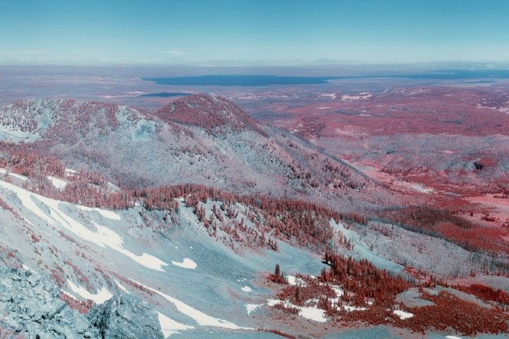 Infrared light renders the familiar unfamiliar. This infrared photograph shows the forests of Yellowstone National Park from Mount Sheridan. (Photograph courtesy National Park Service.)