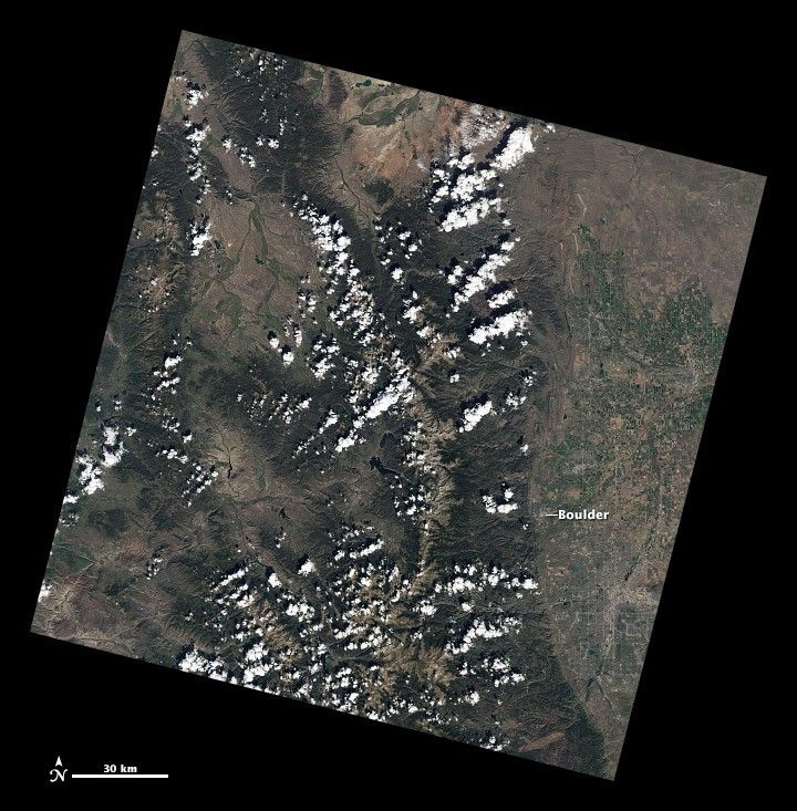 Depending on the image resolution, a city may fill an entire satellite image with grids of streets or it may be a mere dot on a landscape. Before you begin to interpret an image, it helps to know what the scale is. Does the image cover 1 kilometer or 100? What level of detail is shown? Images published on the Earth Observatory include a scale.