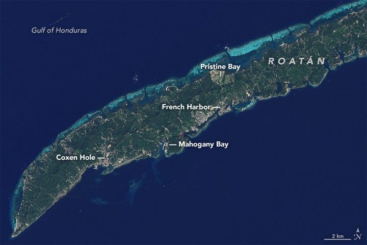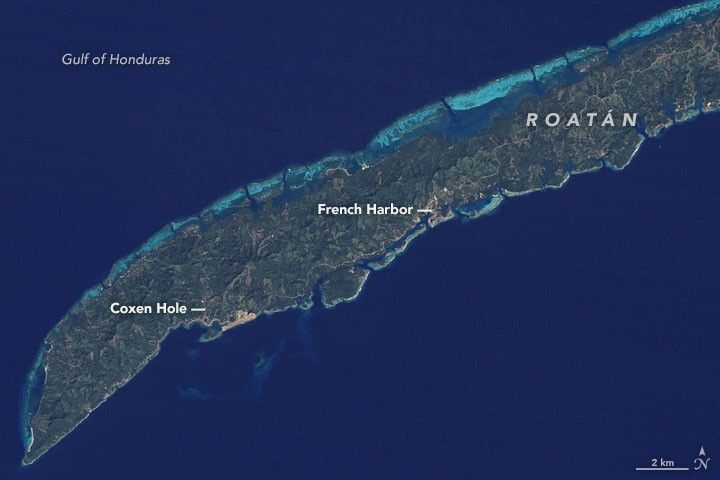 A preliminary analysis of Landsat data by Cascade Tuholske, a geographer at the University of California, Santa Barbara, shows that the built environment on the island increased by 300 percent between 1985 and 2014. “There is an interesting contradiction playing out on Roatán,” said Tuholske. “On the northern coast in the areas of Sandy Bay and West End, the island’s development has led to increased marine conservation awareness and the establishment of marine protected areas. On the southern coast, the boom in tourism is causing increased ecosystem damage through the cutting of mangroves, sewage runoff, and increased garbage.”