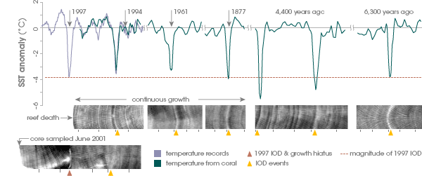 - Coral Reef Death During the 1997 Indian Ocean Dipole Linked to Indonesian Wildfires. Abram, N.J. , Gagan, M.K., McCulloch, M.T., Chappell, J., Hantoro, W.S. (2003) Science 301, 952-955