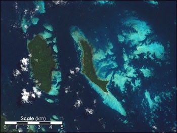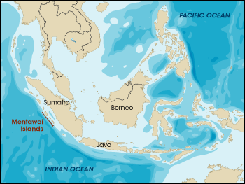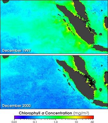 Phytoplankton populations can skyrocket when the ocean receives a sudden influx of iron-rich dust; Saharan dust storms blowing across the Atlantic Ocean have long been known to cause devastating red tides in the Gulf of Mexico. The massive red tide that destroyed the reefs off Sumatra seemed suspiciously similar, but unfortunately, there were no scientific studies of the event that Abram could turn to. Instead Abram used satellite data from the Sea-viewing Wide Field-of-view Sensor (SeaWIFS) to verify local reports of an atypical red tide. “We used SeaWiFS data to examine the productivity in the ocean around the Mentawai Islands at the time of the reef death. The chlorophyll-a concentrations detected by SeaWiFS in December 1997 show a region of elevated productivity around the Mentawai Island chain that is consistent with local observations of the red tide,” says Abram. A high concentration of chlorophyll in the water means a lot of plant life is present.