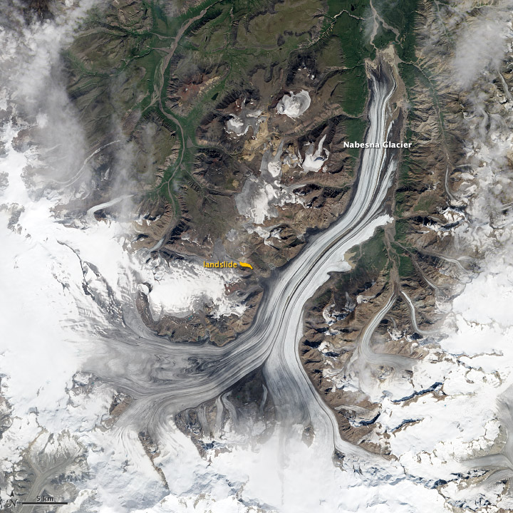 The second image shows the same area after the landslide on August 13, 2013. Debris had tumbled down the valley wall, blanketed the end of the glacier, deflected off the far wall of the valley, and tumbled down the valley toward Nabesna Glacier to the southeast. A stream of glacial melt water was pooling; it should eventually carve a new channel through the debris.