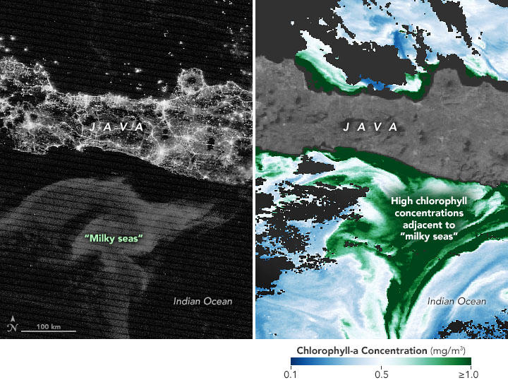 The largest event is shown at the top of this page. The VIIRS instrument on the NOAA-NASA Suomi NPP satellite acquired the image of Java and surrounding seas on August 4, 2019. At its largest extent, the milky sea event spanned 100,000 square kilometers, about the size of Iceland. It began at the end of July and was still visible in early September, spanning two lunar cycles. The images below show the same event alongside measurements of chlorophyll made by NASA’s Aqua satellite.