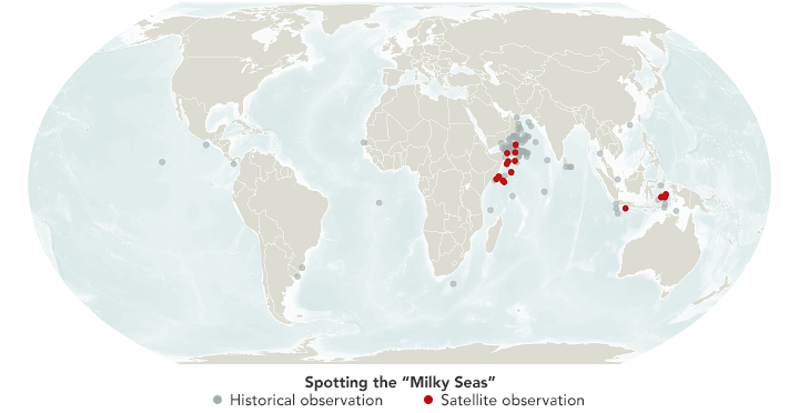 To date, the only in situ study of milky seas occurred in 1985—a chance encounter by a scientific research vessel near Socotra in the Arabian Sea. Miller would like to change that. Since the Suomi NPP and NOAA-20 satellites are both equipped with VIIRS day-night bands and make daily observations, it is possible that scientists could detect a milky sea event from space and then send a research ship out to sample the waters.