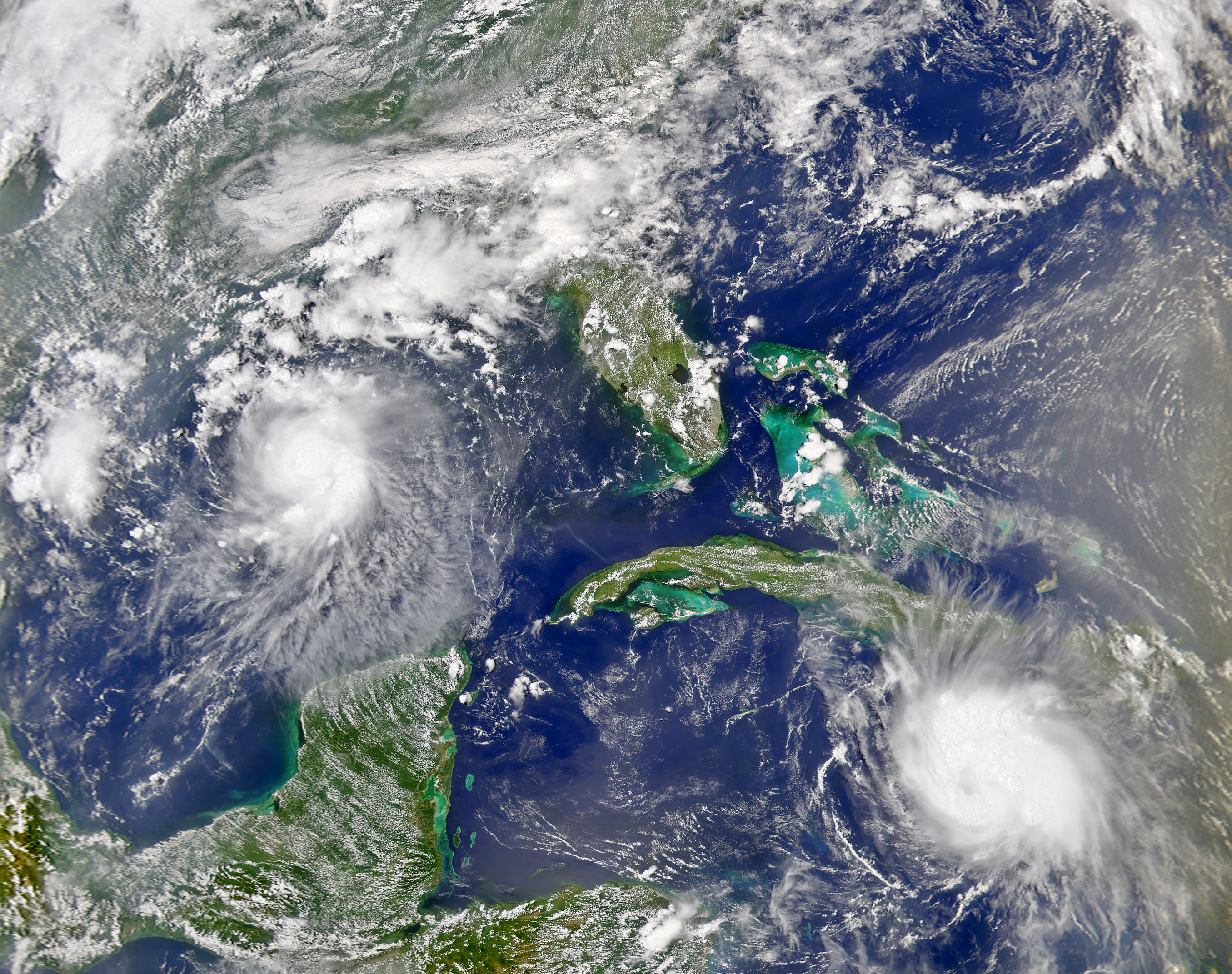 The SeaWiFS instrument onboard the OrbView-2 satellite captured this true-color image of Tropical Storm Bonnie in the Gulf of Mexico and Hurricane Charley in the Caribbean Sea on August 11 at 2:00 PM EDT. At the time this image was taken Bonnie had maximum sustained winds of 65 mph while Charley had just reached hurricane strength with maximum sustained winds of 75 mph. Both storms are expected to impact Florida over the next 48 hours.