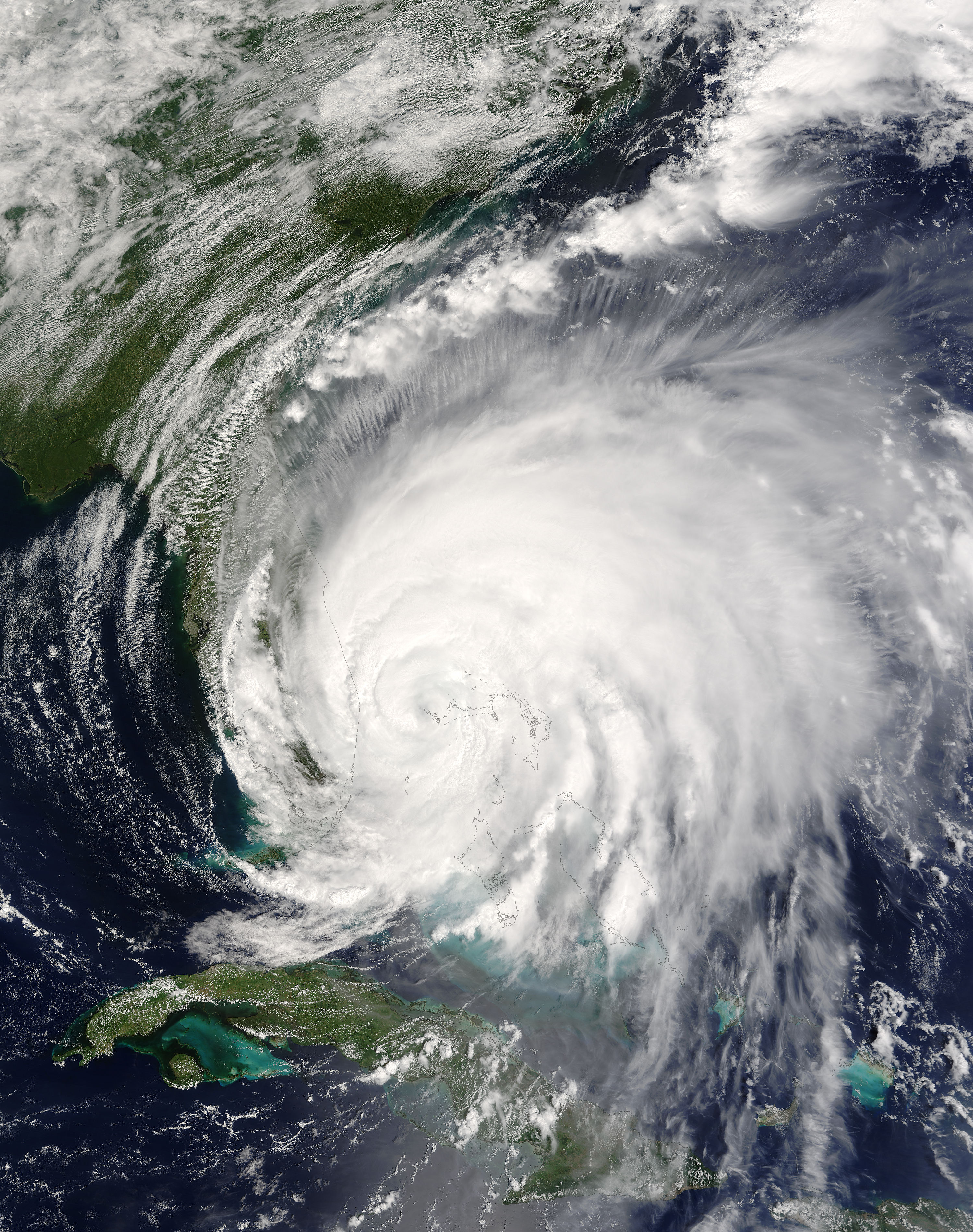 At noon (EDT) on Saturday, September 4, the eye of Hurricane Frances sat just off the coast of eastern Florida when the Moderate Resolution Imaging Spectroradiometer (MODIS) on NASA’s Terra satellite captured this image. Thunderstorms to the northwest of the eye were already ashore, beginning the deluge of the state that lasted throughout the weekend.