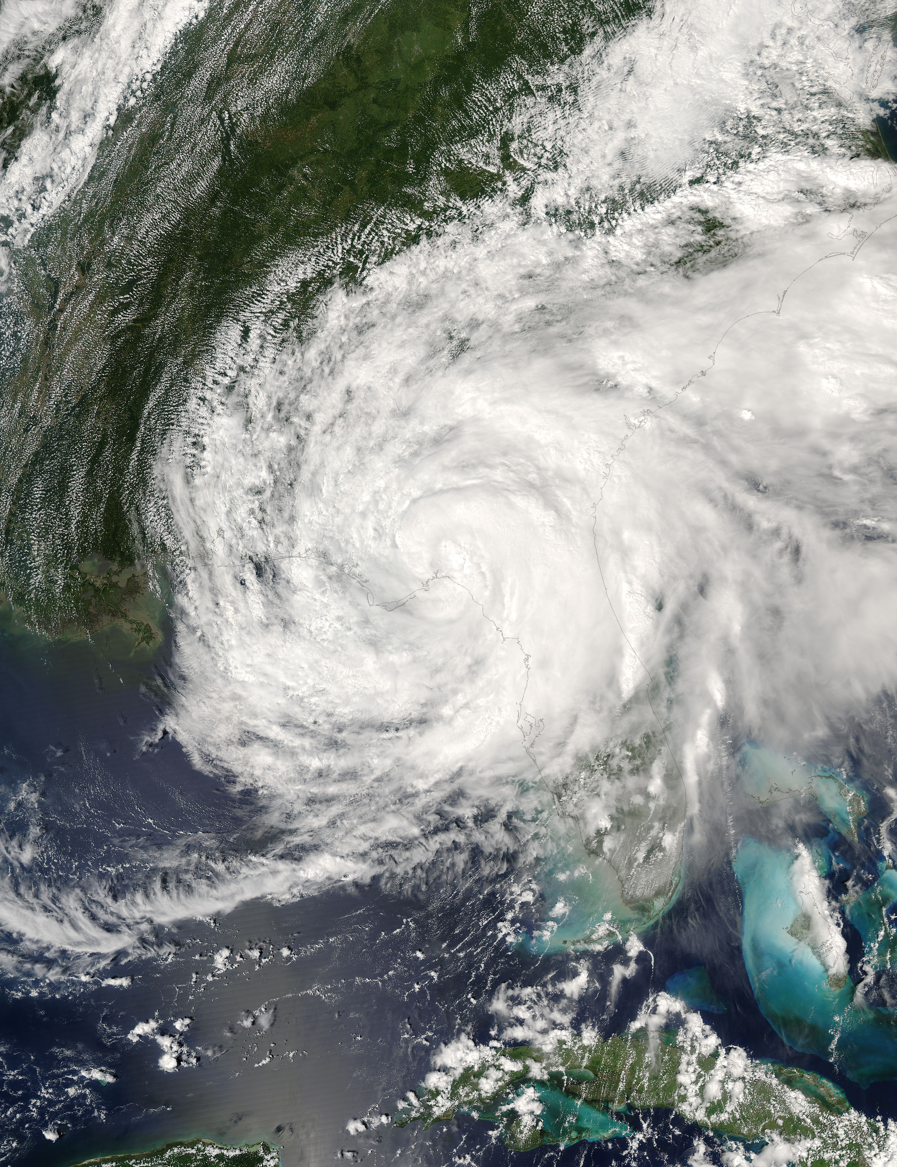 The MODIS instrument aboard NASA's Aqua satellite captured this true-color image of Tropical Storm Frances on September 6, 2004 at 19:00 UTC (3:00 PM EDT). At the time this image was taken Frances had just made landfall 30 miles south of Tallahassee, Florida and was dumping copious amounts of rainfall in the panhandle region of Florida. Maximum sustained winds were near 65 mph and the storm was moving towards the north-northwest at 8 mph.