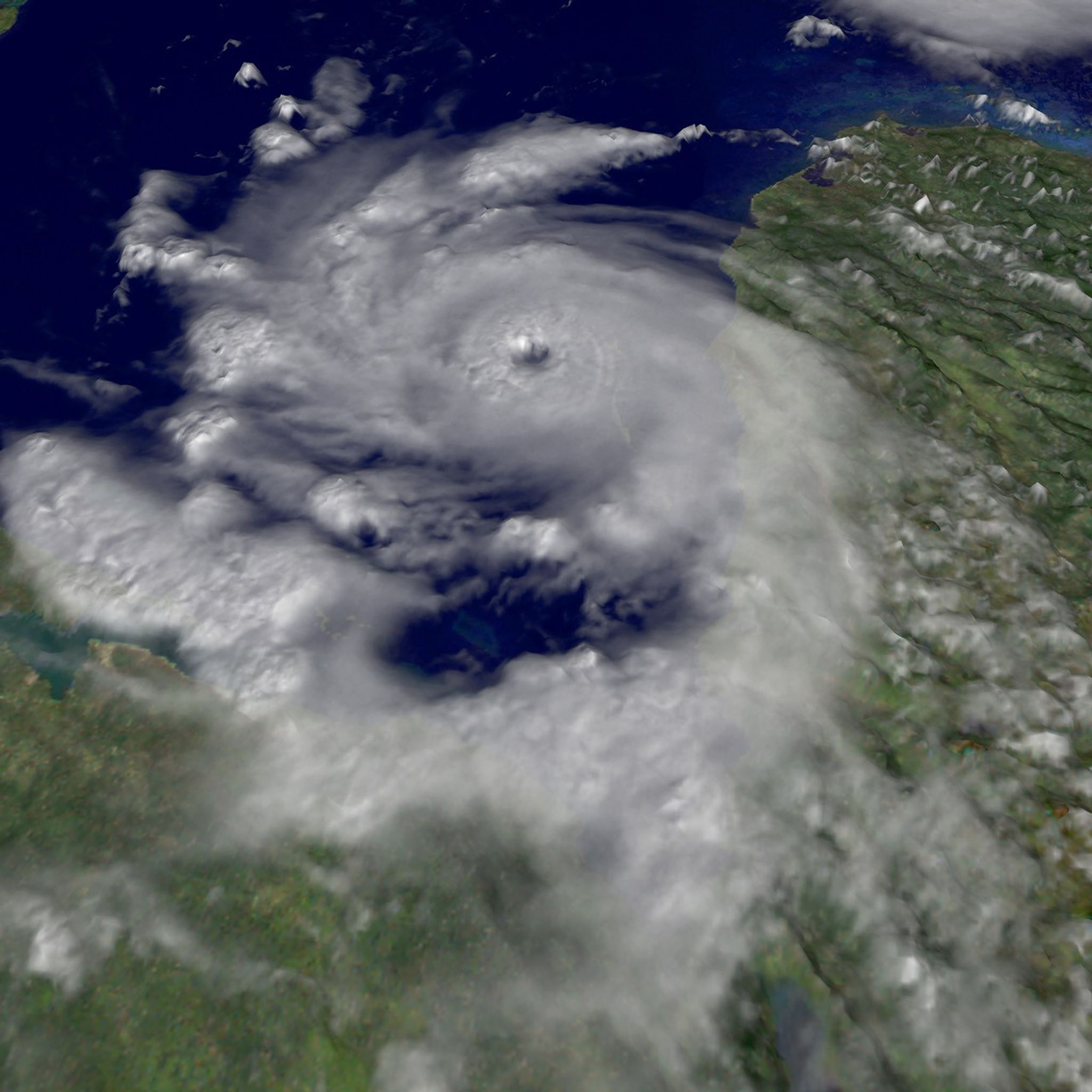The above image is a combination of visible and thermal infrared data (for clouds)acquired by a NOAA Geostationary Operational Environmental Satellite (GOES-8) onOctober 8, 2001, at 2:45 p.m., and the Moderate-resolution Imaging Spectroradiometer (MODIS)(for the color of the ground). The three-dimensional view is from the south-southeast(north is towards the upper left). Belize is off the image to the left.