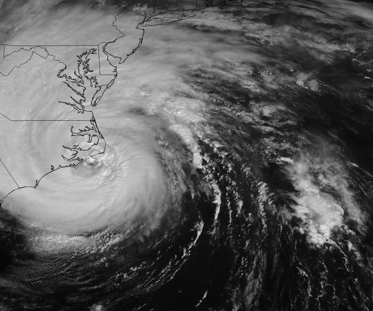 Although she had subsided from a Category 5 to a Category 2 storm, Hurricane Isabel still packed considerable punch as she came ashore between Cape Lookout and Cape Hatteras on North Carolina’s Outer Banks on September 18, 2003. Isabel grew to a massive size just before she hit land, with hurricane-force winds radiating as far as 185 km (115 miles) from the eye, and tropical storm-force winds extending roughly 555 km (345 miles) outward from the eye.