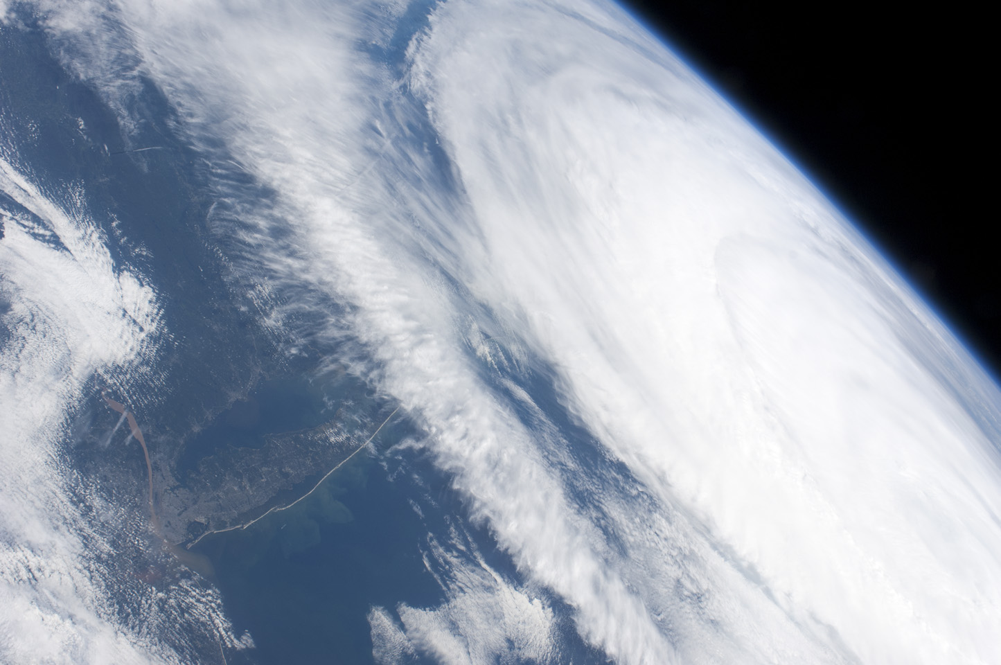 Hurricane Katia had diminished to Category 1 strength on the Saffir-Simpson scale by the time this astronaut photograph was taken, but it still presented an impressive cloud circulation as its center passed the northeastern coast of the United States on September 9, 2011. The storm reached Category 4 strength earlier on September 5, making it the second major hurricane of the 2011 Atlantic hurricane season. Katia remained over open waters of the Atlantic Ocean for all of its lifetime, unlike two preceding storms of the season— Hurricane Irene and Tropical Storm Lee—that both made landfall on the continental U.S.