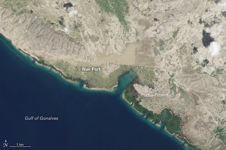 The mouth of the Cavaillon River is shown in detail in the third image pair. “You can see from the change in ocean color that a significant amount of debris has been washed away,” Morel said. “I would conjecture that a good amount of topsoil, which Haitian farmers can’t really afford to lose, is likely a large contributor to that.”