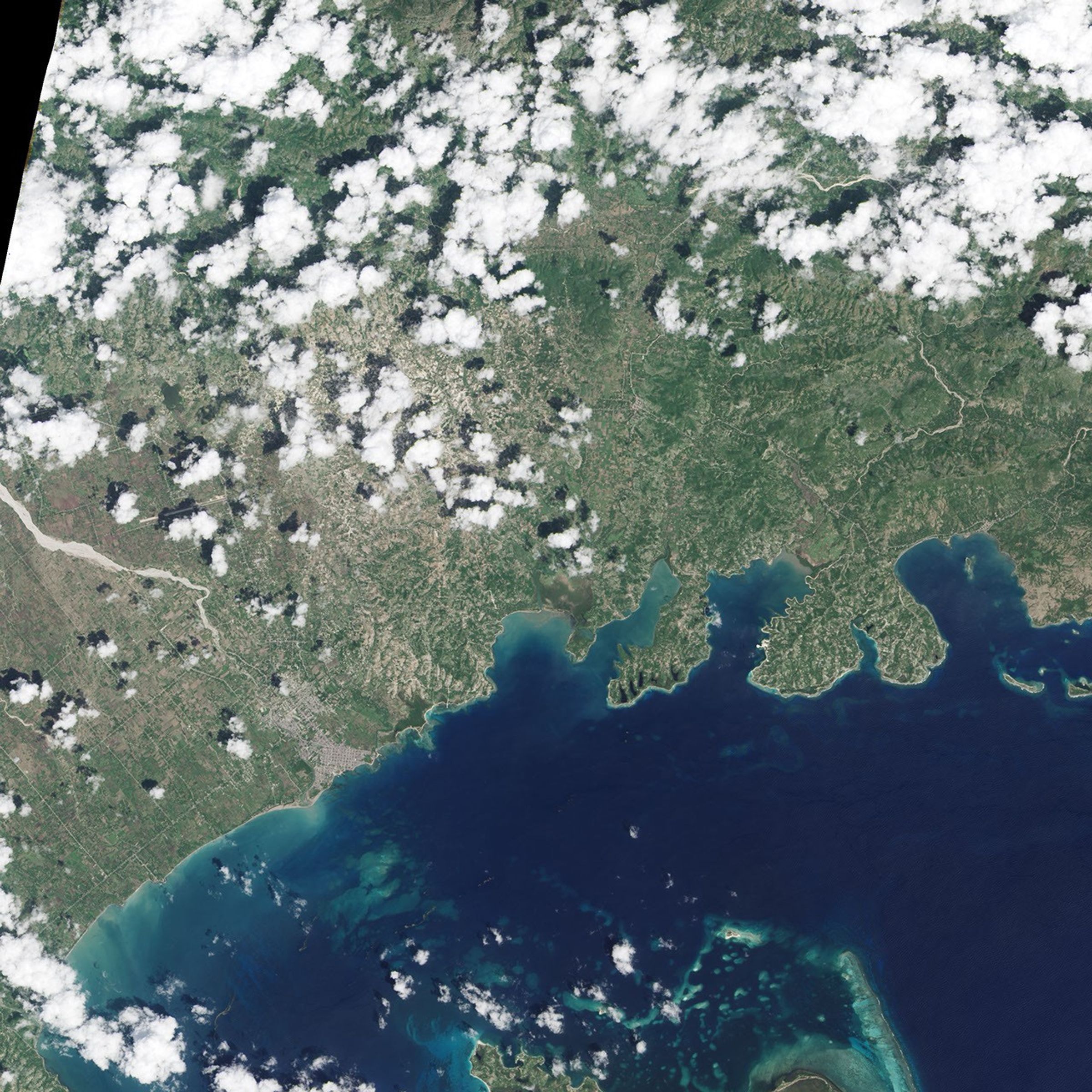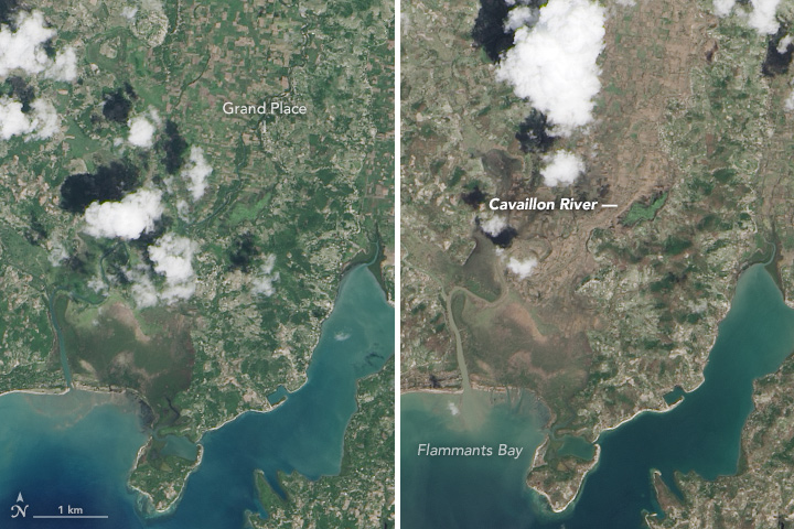 The mouth of the Cavaillon River is shown in detail in the third image pair. “You can see from the change in ocean color that a significant amount of debris has been washed away,” Morel said. “I would conjecture that a good amount of topsoil, which Haitian farmers can’t really afford to lose, is likely a large contributor to that.”