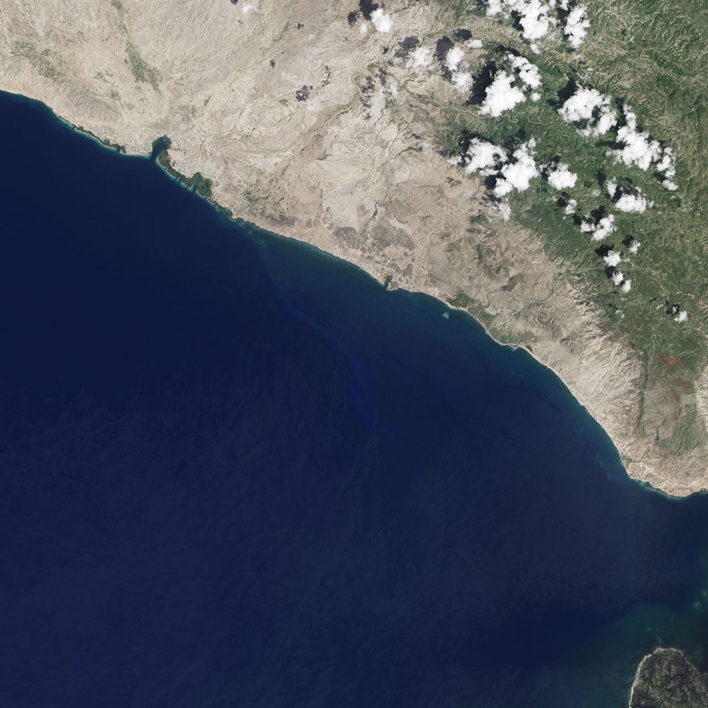 Peter Wampler, a geologist at Grand Valley State University who has worked on water projects in Haiti, points out another obvious change: the amount of sediment coursing out of the rivers and streams. “This sediment is derived from slopes that often lack protective tree cover and soils,” he said. As a result, abundant sediment reaches the ocean, visible as the light-brown color at the mouth of the Ravine du Sud.
