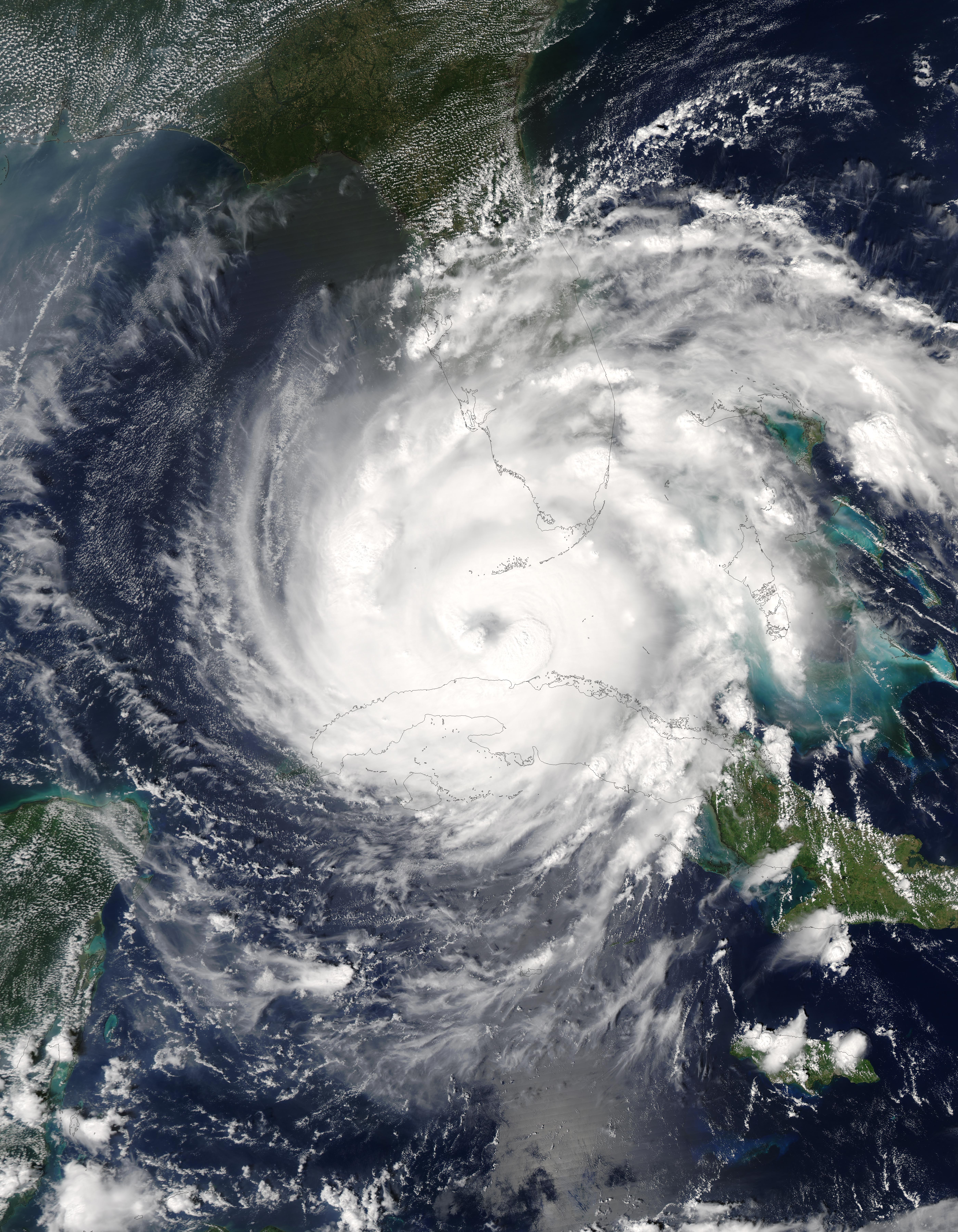 Category 2 Hurricane Rita was passing between the Florida Keys and Cuba when the Moderate Resolution Imaging Spectroradiometer (MODIS) on NASA’s Aqua satellite captured this image at 2:35 p.m. Eastern time on September 20, 2005. At the time, Rita had peak sustained winds of 160 kilometers per hour (100 miles per hour), with hurricane-strength winds extending well away from the storm’s center, including settlements in the Key Islands and in Cuba’s capital, Havana.