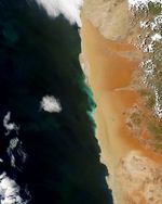 The Moderate Resolution Imaging Spectroradiometer (MODIS) on NASA’s Aqua satellite captured this natural-color image on February 29, 2012. The pale-hued surface waters snake along the shore of the Namib Desert, stretching roughly 150 kilometers (90 miles).
