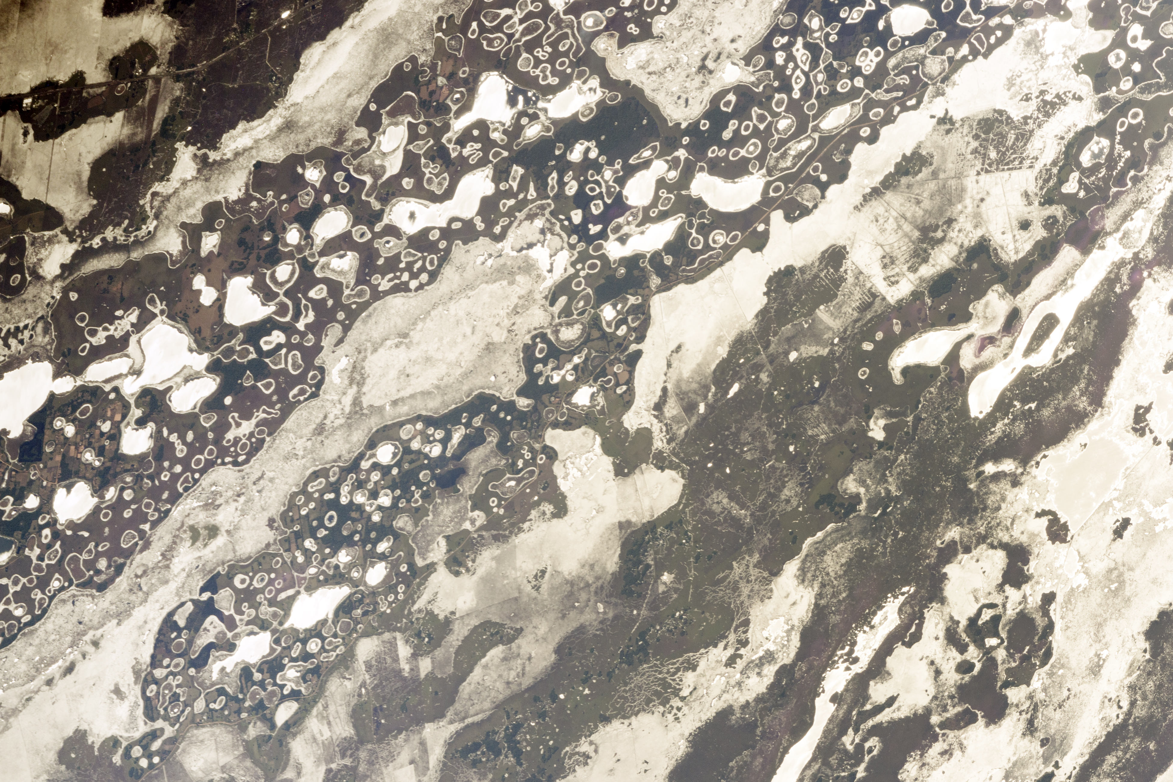 It is unclear why the higher areas have the lakelets, or why they are so round in shape. But one idea is that during very dry times in the last Ice Age, dry winds scoured out numerous hollows, as we see in many deserts today. When the climate grew wetter, these depressions filled with water and marshy vegetation colonized the shorelines. As sediment slowly washed into the lakelets, all angular shoreline shapes became smoothed and rounded. The smallest ponds are almost completely filled with vegetation, except for a halo along the shorelines where open water reflects the Sun. It is unclear why the ponds have developed this interesting vegetation pattern.