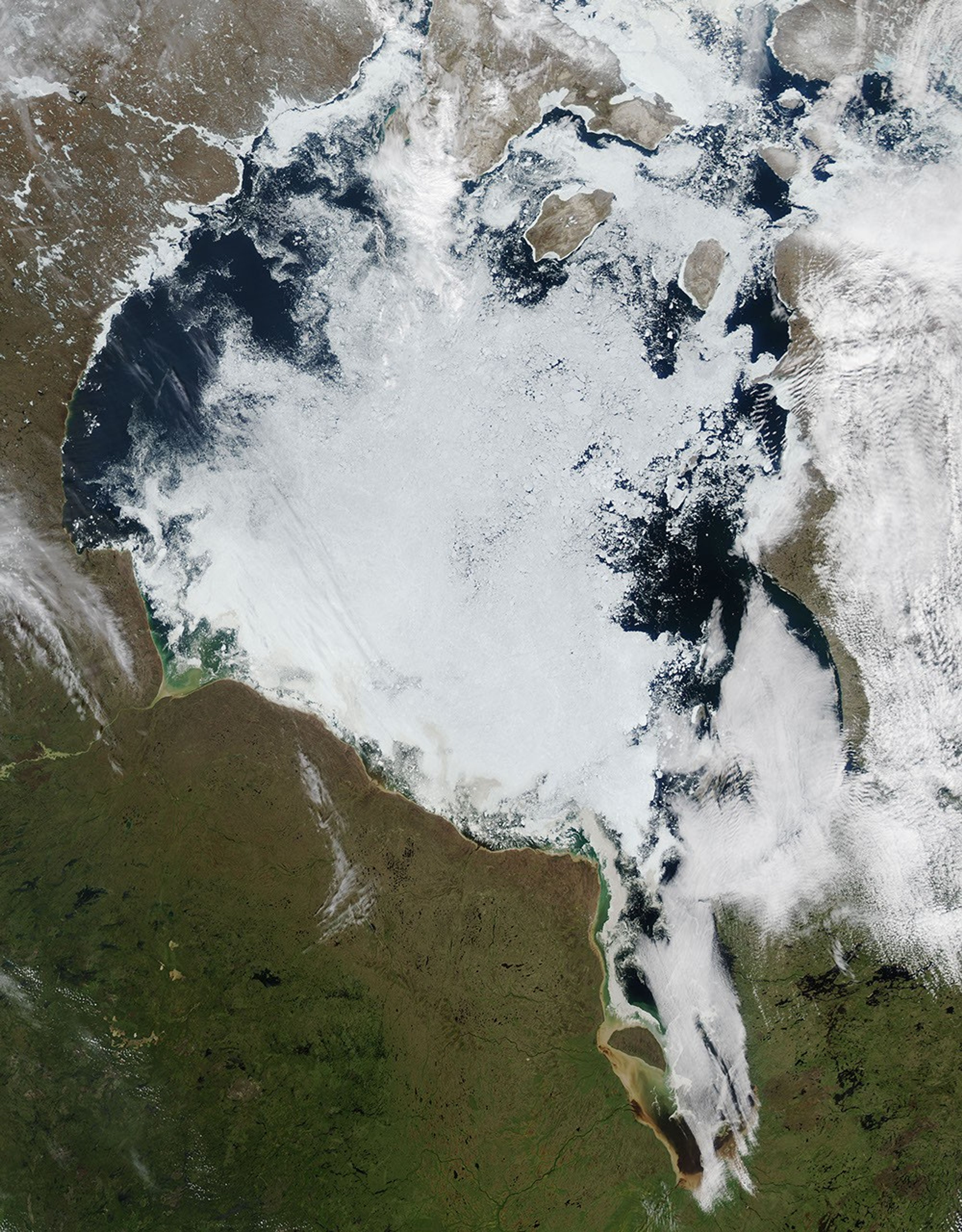 Every year, Hudson Bay cycles through periods dominated by ice and open water. Thick layers of sea ice cover most of the surface of the shallow inland sea during the winter. As longer and warmer days arrive in May and June, ice begins to thaw and break up. By August, Hudson Bay is usually ice-free. The cycle begins anew in October and November as temperatures drop.