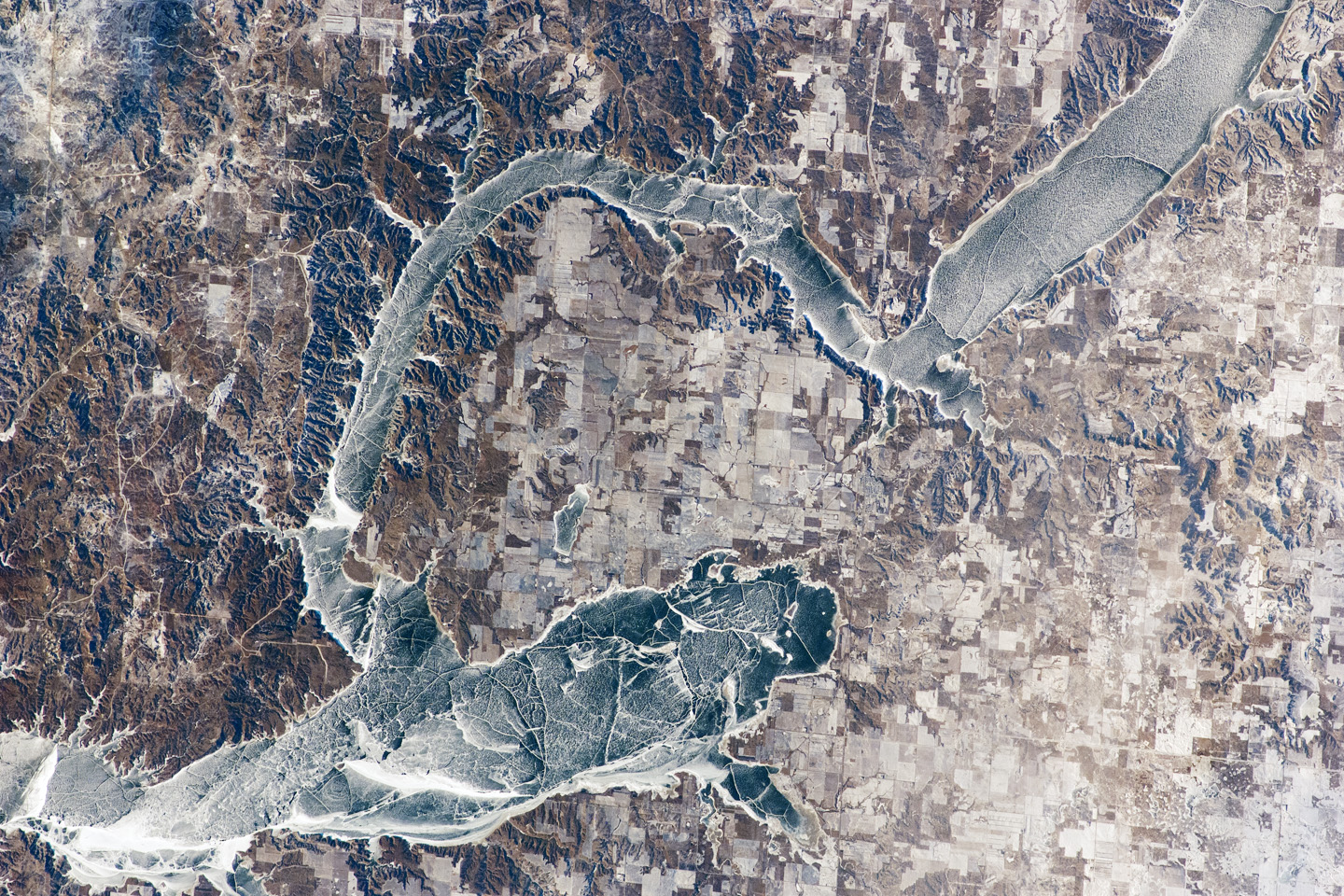 This photograph taken by an astronaut on the International Space Station illustrates the harsh winter conditions frequently experienced in North Dakota. Ice covers the surface of northwestern Lake Sakakawea, a reservoir on the Missouri River. A local weather station near New Town, North Dakota, reported an air temperature of -24°C (-11°F), with a wind chill of approximately -32°C (-25°F) at 10:36 a.m. local time—six minutes before the image was taken. In addition to the grey ice on the lake, a dusting of white snow highlights the agricultural fields to the north and northeast, as well as fissures and irregularities in the ice surfaces. For a sense of scale, the arms of the lake to either side of New Town are approximately 10 kilometers (6 miles) apart.