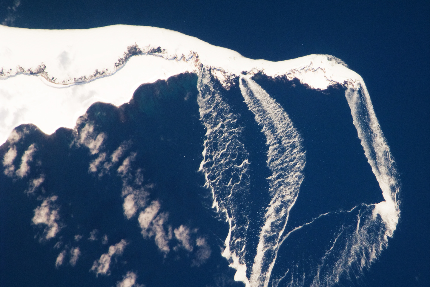 Smaller ice floes are breaking off from the main ice mass at gaps between the islands and forming fingerlike projections of ice fragments that extend to the southeast (image lower right). Surface winds may be channeled through these gaps and accelerated, hastening the breakup and movement of ice.