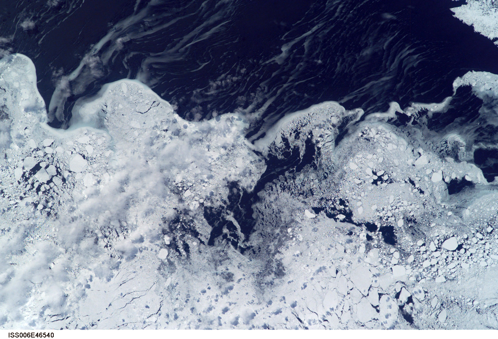 Sea ice drifts in the Labrador Sea in this photograph taken from the International Space Station. The ice is probably breaking away from pack ice along the coast of Newfoundland during the spring melt. NASA scientists studying satellite data believe warmer-than-normal temperatures in the Arctic may be the cause of a decline in sea ice over the past 20 years.