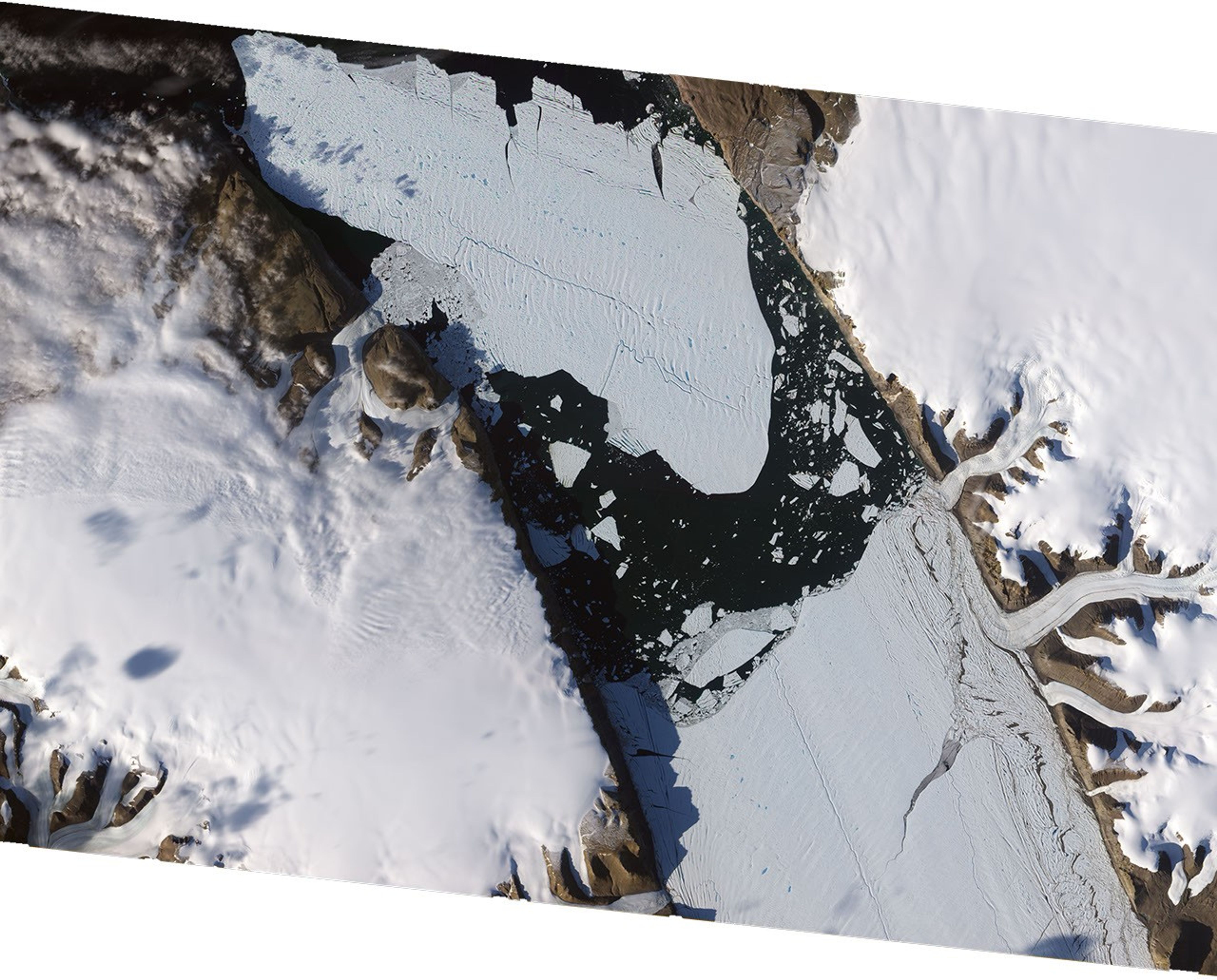 Along the glacier’s new front, some smaller icebergs appear to have broken free, and ice fragments litter the water surface between the ice island and the glacier. Also visible in this image are multiple small glaciers that feed the Petermann, flowing down to the massive glacier from the northeastern side of the fjord.