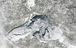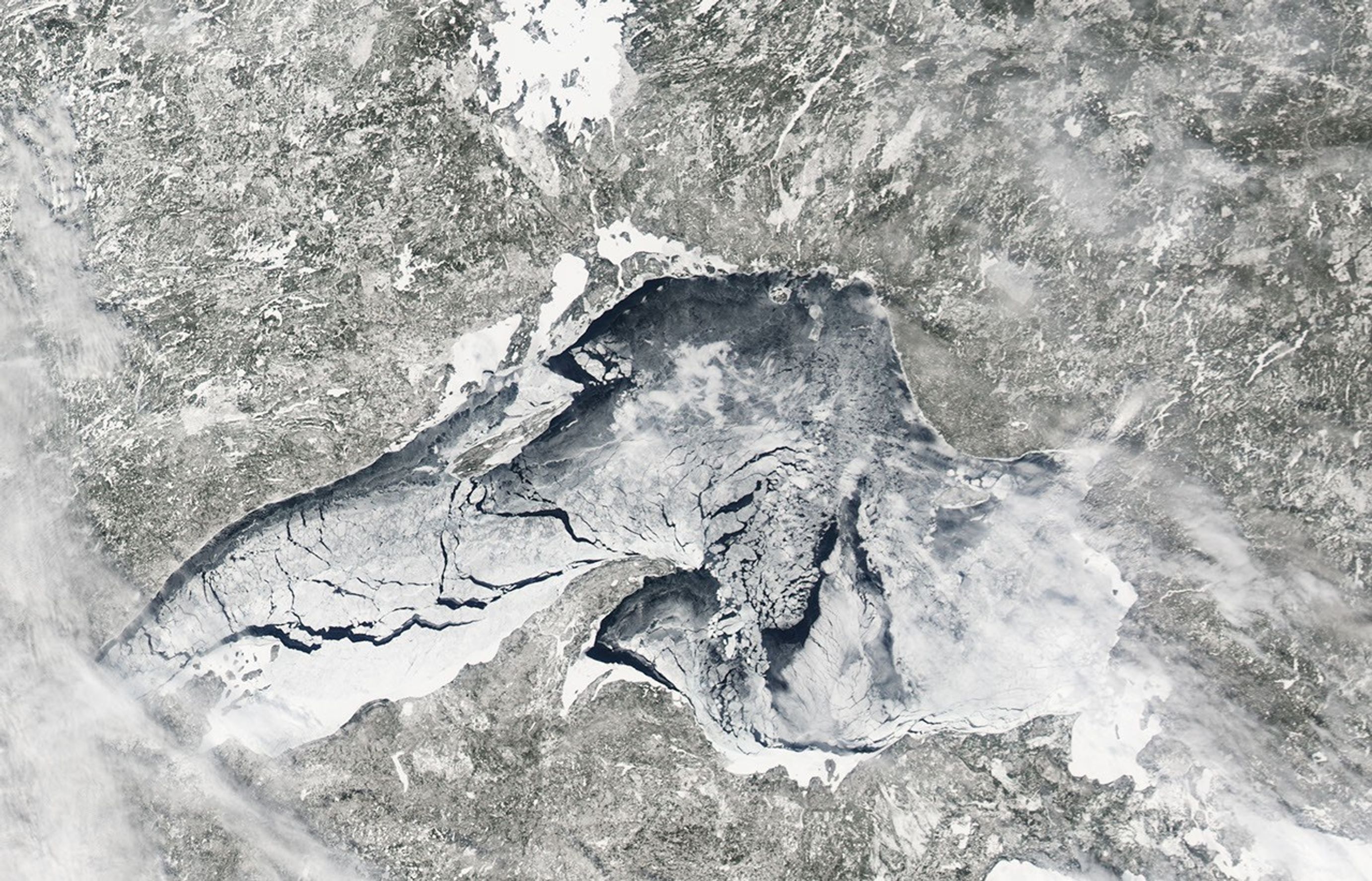 In this true-color, photo-like image, ice floating on the surface of Lake Superior ranges in color from white to pale gray-blue. The ice appears most solid along the southern shore of the western half of the lake. North of that solid band of ice, cracks reveal deep blue lake water. Dark lake water also appears in the eastern part of the lake, especially along its northern shore. As it does in the west, ice cover appears relatively unbroken at the extreme southeast end of the lake.