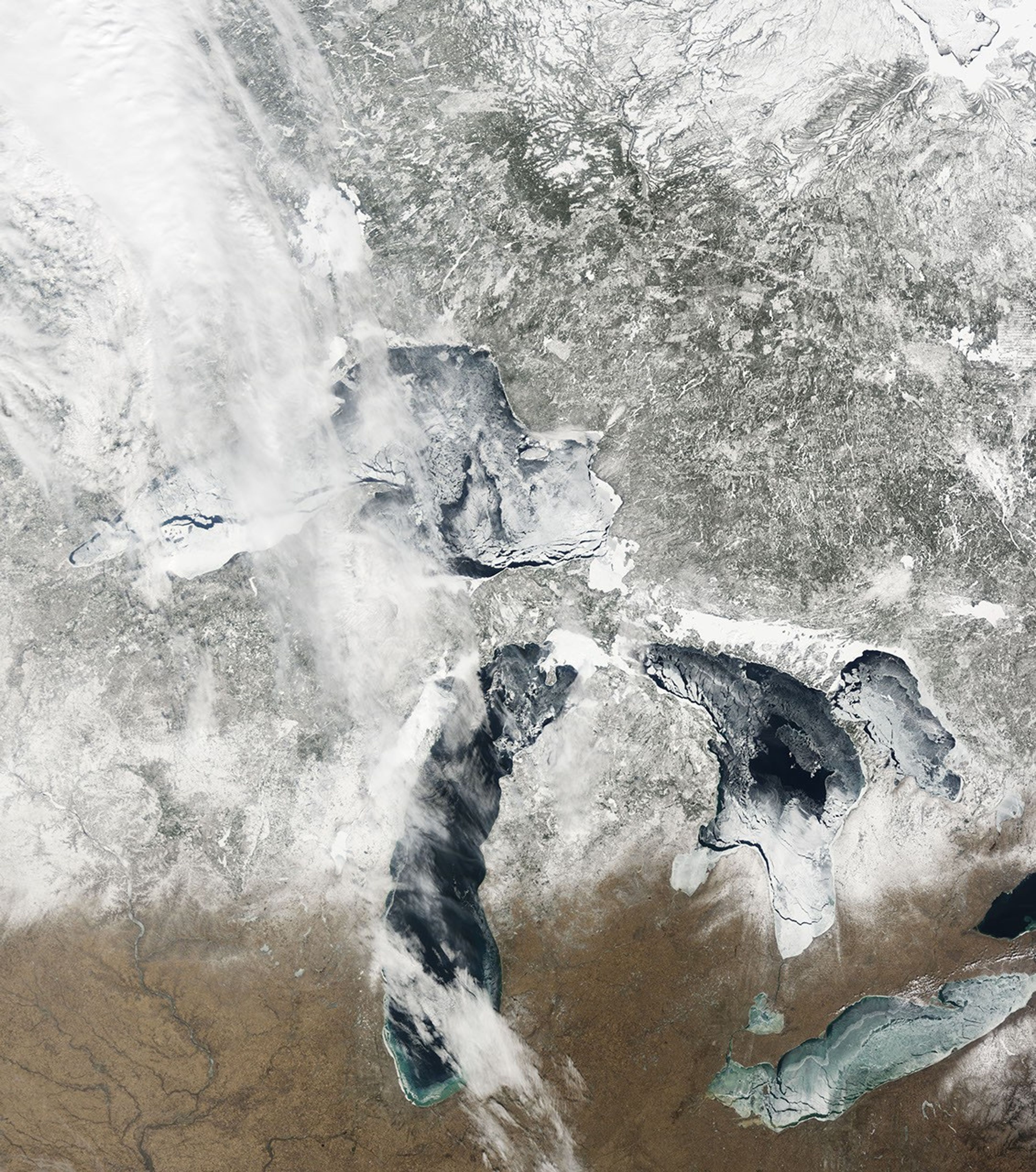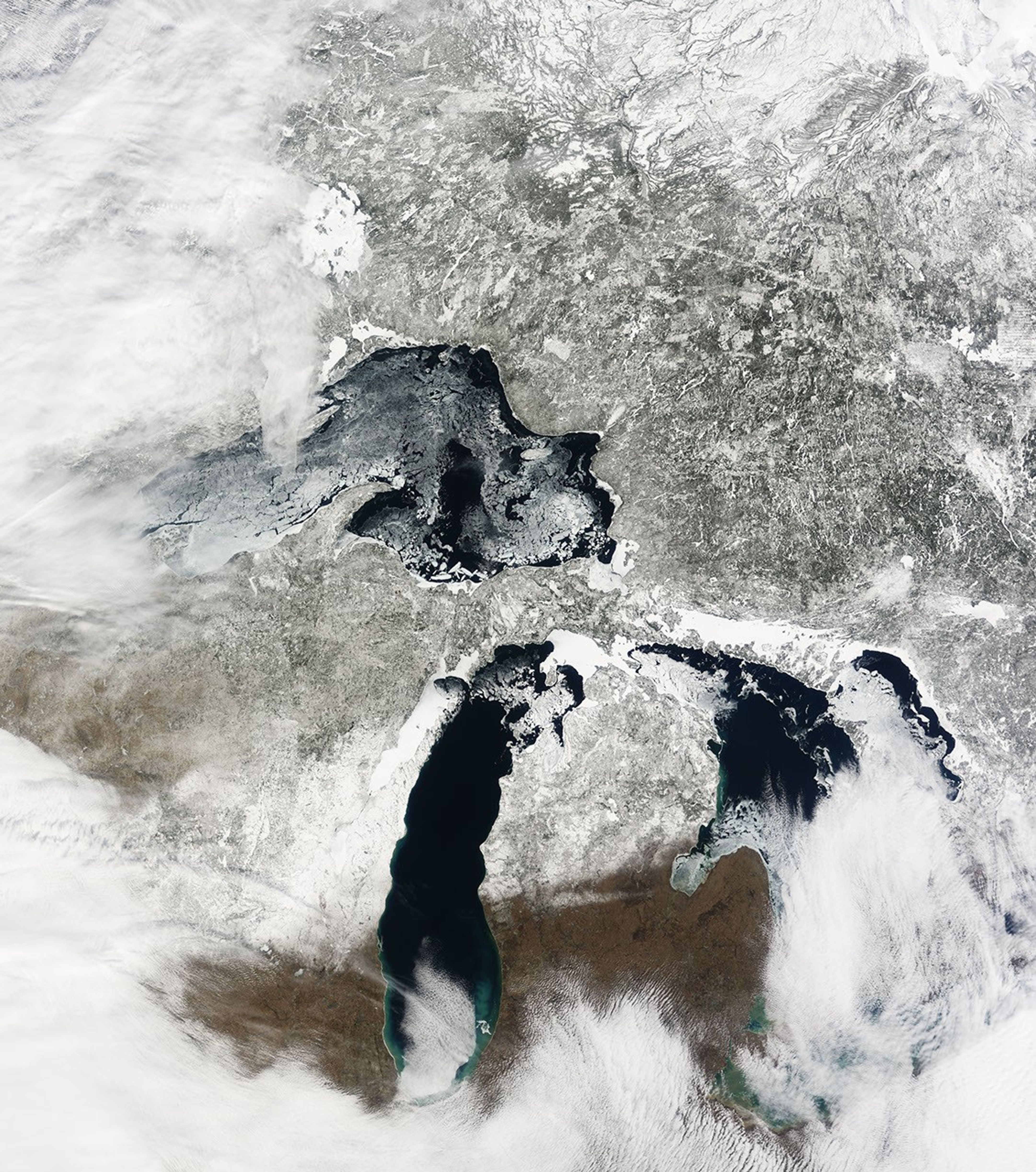 The lower image shows the bay and Lake Huron on March 4, 2009, the last cloud-free day prior to the wind storm. In the five days that elapsed between the two images, the ice on the lake and in the bay broke up. Ice on the portion of the lake shown here had largely disappeared. Saginaw Bay went from what appears to be a solid sheet of ice on March 4 to chunks and thin sheets of ice separated by lines of open water on March 9. The wind undoubtedly helped to break the ice up into slabs and chunks, which were then driven on shore. The retreat of winter is also evident on land, where brown earth was emerging from under widespread snow.