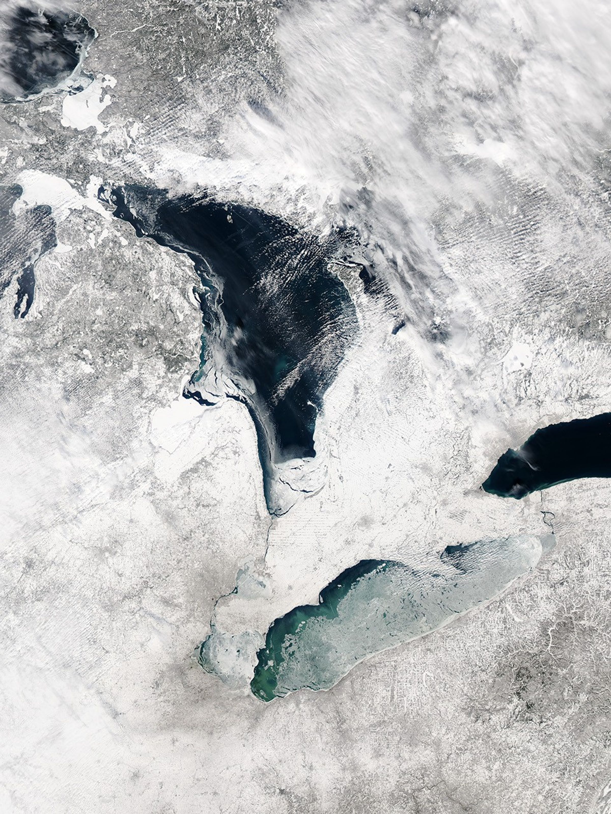 It is not unusual for the surface of Lake Erie to be covered by ice this time of year. This true-color image was taken on February 8, 2004, by the Moderate Resolution Imaging Spectroradiometer (MODIS) aboard NASA’s Terra satellite. The scene shows ice covers most of Lake Erie, with the exception of a long narrow swath of surface water visible along its northern coastline. The opening in the ice reveals light blue and turquoise patterns in the water, probably the result of sediments. Ice has also formed along most of the western coastline of Lake Huron, to the north. (This false-color image, produced using a different MODIS band combination, can help in distinguishing snow and ice from clouds.)