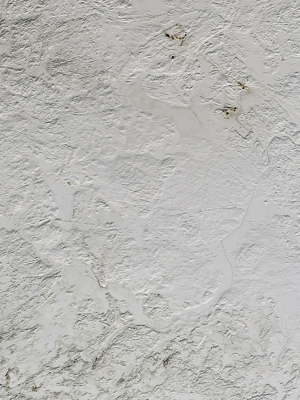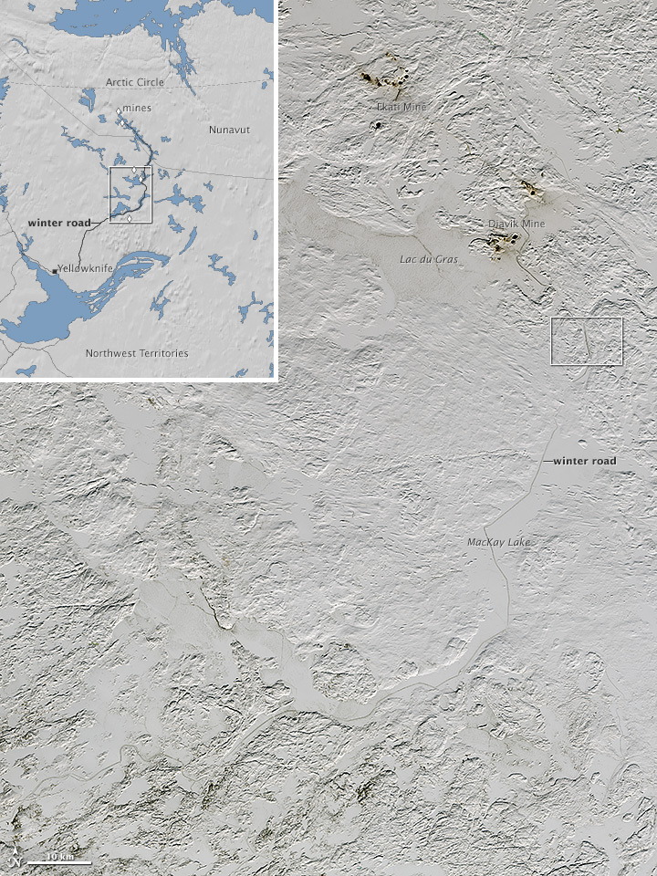The images above were acquired by the Landsat 8 satellite on February 24, 2015. The top image shows in detail where the winter road divides into two lanes over one of the lakes. The wider view includes almost all of the ice trucking route in northwest Canada. The winter road terminated near the Diavik Diamond mine in 2015; in some years, it has been extended farther north to reach the Lupin and Jericho mines in Nunavut, but both have recently been shuttered.