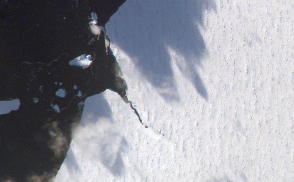 Once the ISS crew had located the iceberg, they managed to photograph it successfully with the “long”, 800-mm lens that provides close-up photos (lower image). Handling the longer lens requires practice. Because of the speed of the spacecraft and the length of the lens, it is necessary for the astronaut to “track” the target, that is, to swing the camera slowly to keep the target in the middle of the camera’s view finder. If the photographer tracks too slowly or too quickly, the image looks smeared.
