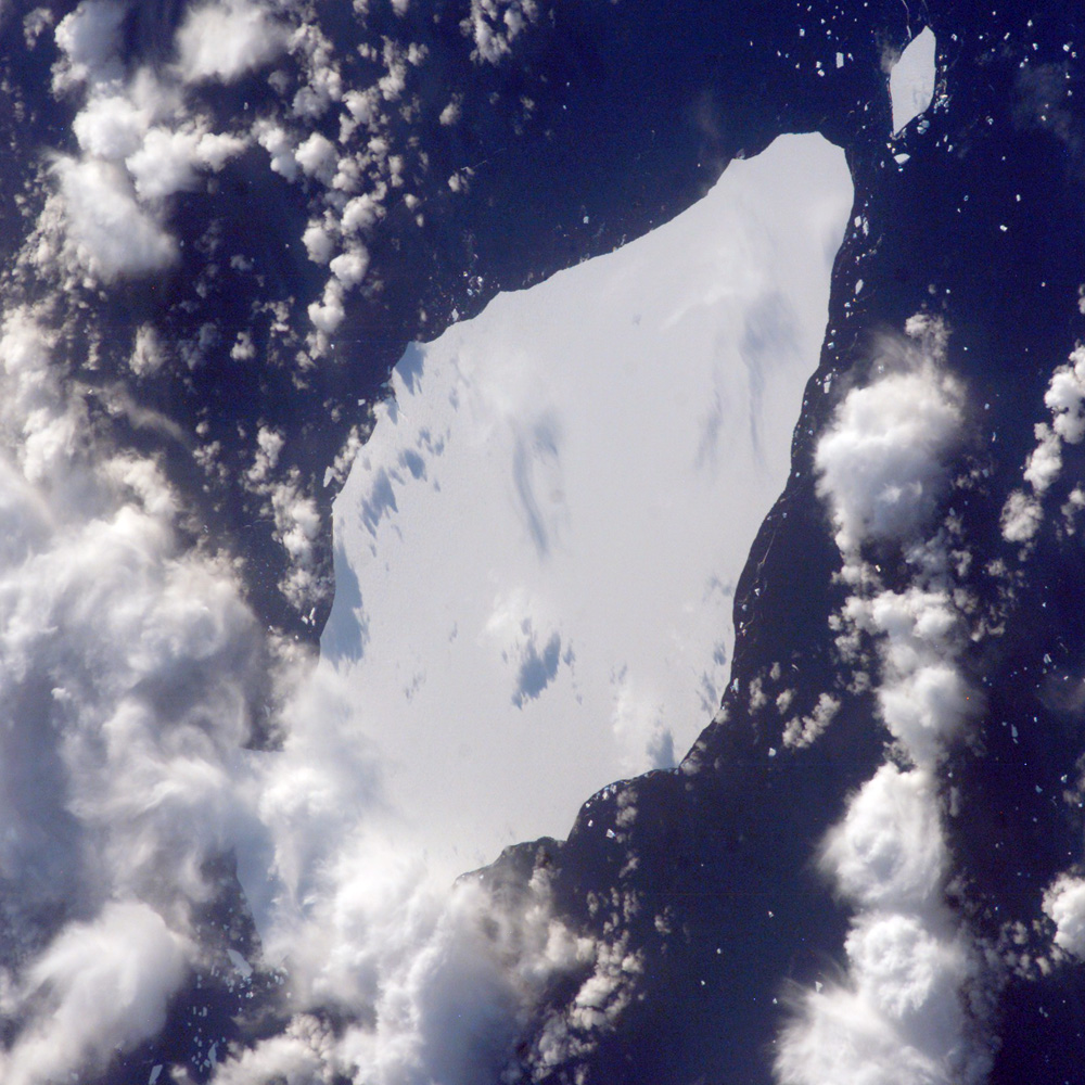 Images of the iceberg are being acquired from the ISS to support a study of massive icebergs—part of NASA International Polar Year activities. The study will increase understanding of the way ice sheets evolve as climate changes. When large masses of ice float into warmer waters north of their usual latitudes, they undergo change at rapidly increased rates. Changes that would take decades to occur in Antarctica can happen in a few years or even months in the warmer conditions at 50 degrees south latitude. The crew of the ISS will continue to collect imagery of the accelerating breakup of iceberg A22A as weather, orbital, and illumination conditions allow.