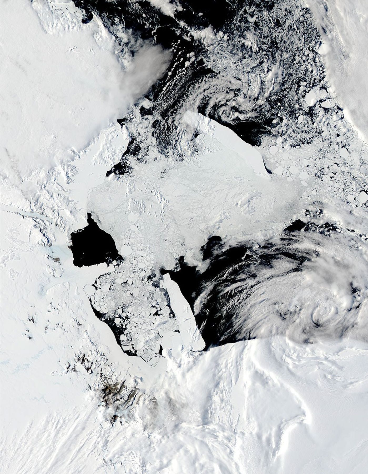 Then, after months of stillness, a January 14 image from MODIS revealed that C-19 was again on the move. Over little more than week, the huge berg pivoted northward from its eastern end. The effect was like opening a floodgate, and much of the sea ice trapped in the Ross Sea between C-19 and B-15 poured out into the Southern Ocean. The animation provided here shows the B-15 (left) and C-19 (center) icebergs in the Ross Sea and the movement of C-19 between September 22, 2002, and February 3, 2003. C-19 drifts from the center of the scene out to the far right edge.
