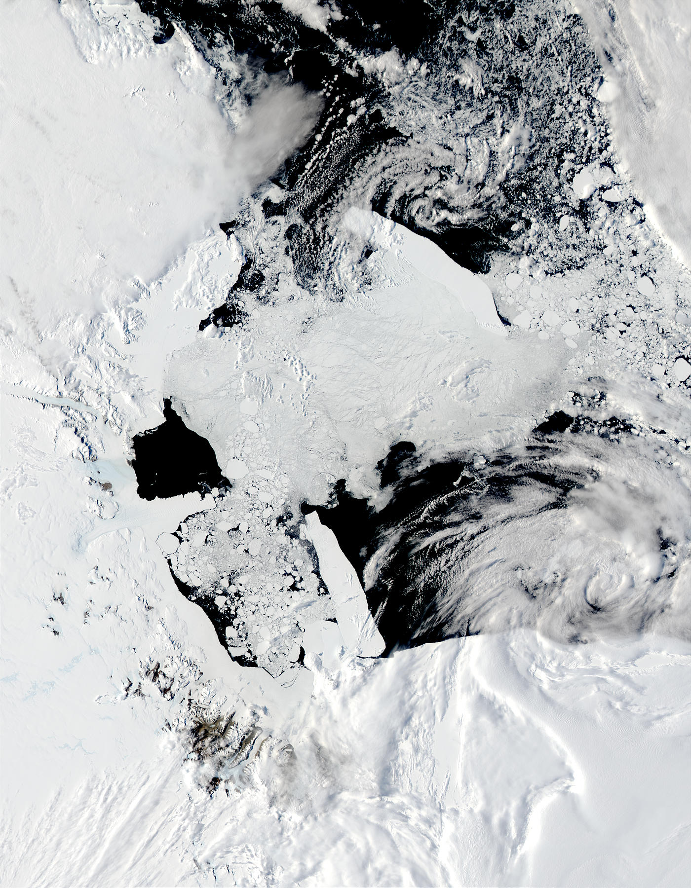 Imagery from the Moderate Resolution Imaging Spectroradiometer (MODIS) on the Terra satellite revealed an unusual build up of sea ice in the waters of the Ross Sea near Ross Island. The island is home to the National Science Foundation’s McMurdo Research Station, the United States’ Antarctic research hub. The seasonal ice remained in the sea longer than expected, and created trouble for ships trying to bring in supplies to the research station. Ice was so thick that in early January, the U.S. Coast Guard was forced to send out a second icebreaking ship to assist the one that had gone out with the McMurdo resupply ship.