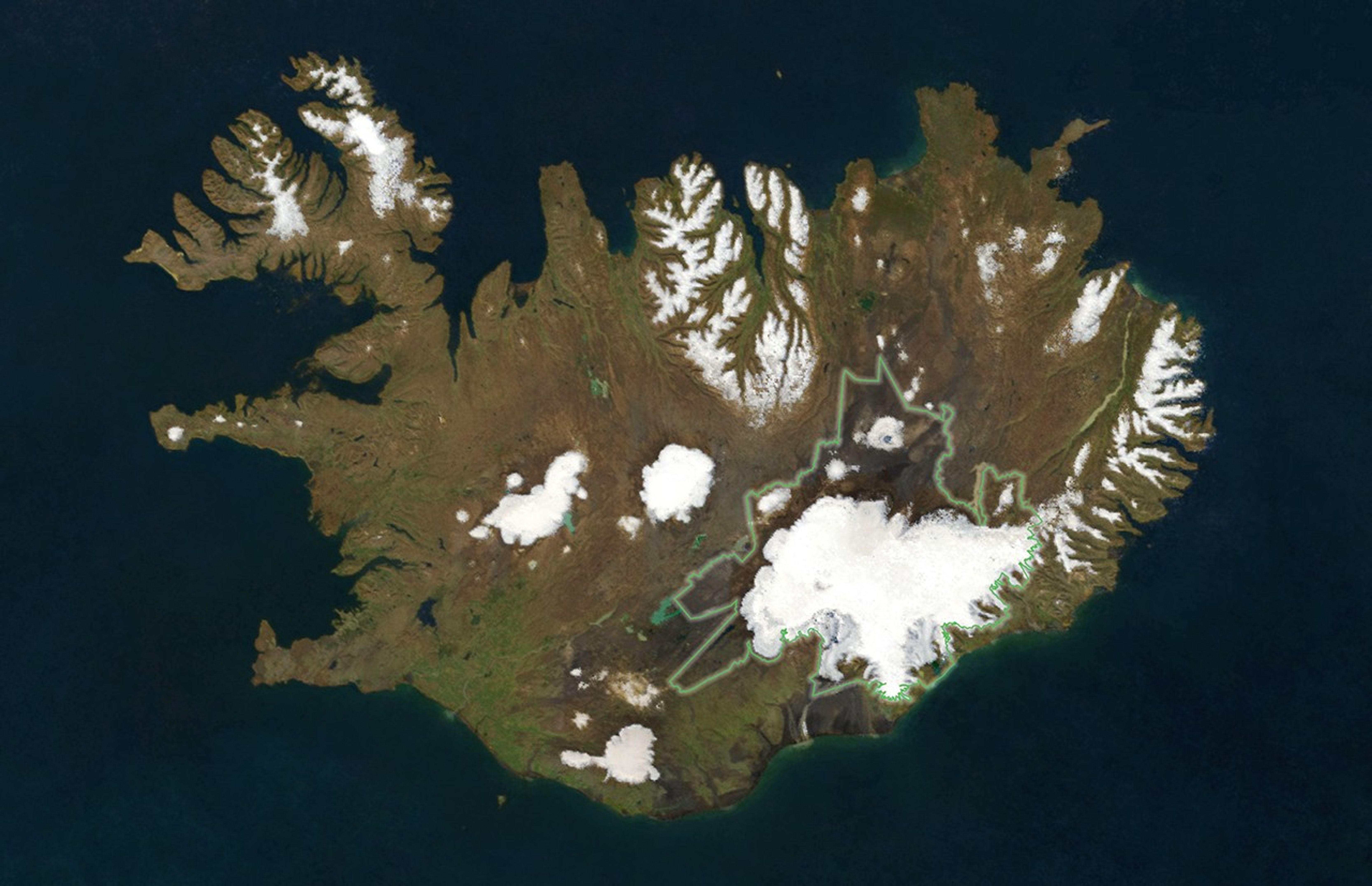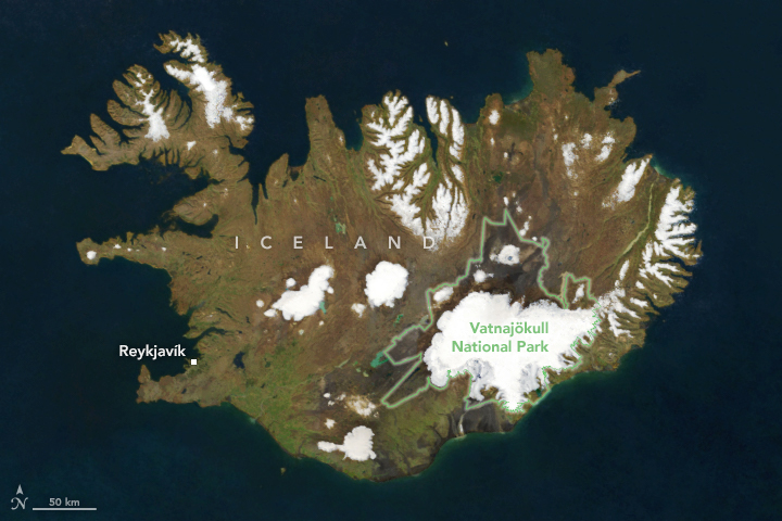 Skeiðarárjökull is located in the southern region of Vatnajökull National Park, which covers about 14 percent of the country. The map above shows the extent of the park and the Vatnajökull ice cap, which covers 8 percent of the country and is Europe’s largest ice cap by area. The map was created from a composite of satellite images acquired between June 1, 2019, and September 20, 2019, by the Moderate Resolution Imaging Spectroradiometer instruments on NASA’s Aqua and Terra satellites.