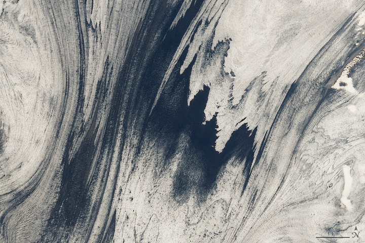 These first two images on this page show the Skeiðarárjökull glacier on July 2, 2019, as observed by the Operational Land Imager on Landsat 8. The black streaks in the close-up image below are volcanic ash layers that became embedded in the glacier after previous eruptions.