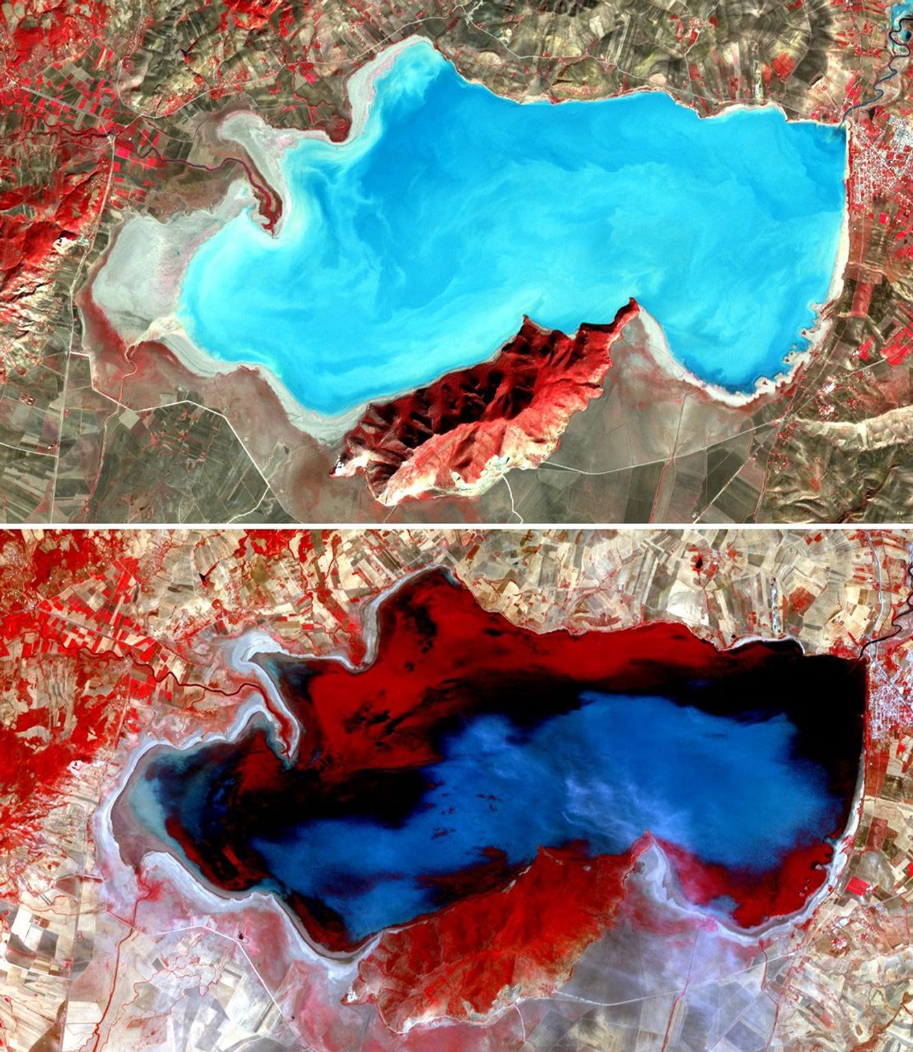 The pair of satellite images above shows changes in the lake level and aquatic vegetation between November 14, 2001 (top), and July 29, 2005 (bottom). Vegetation appears red, bare or thinly vegetated ground is tan, and water is blue. Although the lake level is higher in 2005 than in 2001, a large part of the lake appears red due to the presence of aquatic plants. Because dams have sharply reduced the freshwater inflow to the lakes and marshes, reed beds, sedges, and other fresh-water plant species have been replaced with salt-loving plants. These changes have produced a sharp reduction in the migratory bird populations, which depended on the mix of plants that used to exist.