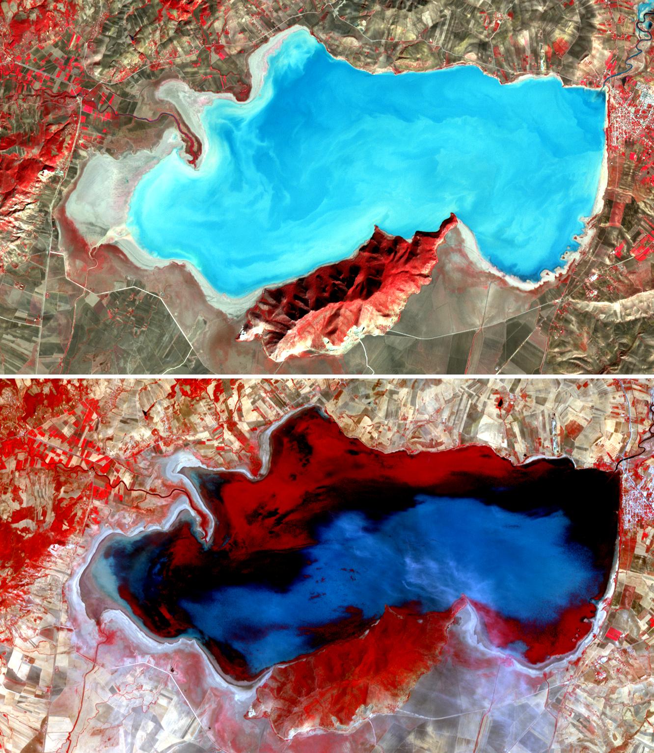 The pair of satellite images above shows changes in the lake level and aquatic vegetation between November 14, 2001 (top), and July 29, 2005 (bottom). Vegetation appears red, bare or thinly vegetated ground is tan, and water is blue. Although the lake level is higher in 2005 than in 2001, a large part of the lake appears red due to the presence of aquatic plants. Because dams have sharply reduced the freshwater inflow to the lakes and marshes, reed beds, sedges, and other fresh-water plant species have been replaced with salt-loving plants. These changes have produced a sharp reduction in the migratory bird populations, which depended on the mix of plants that used to exist.