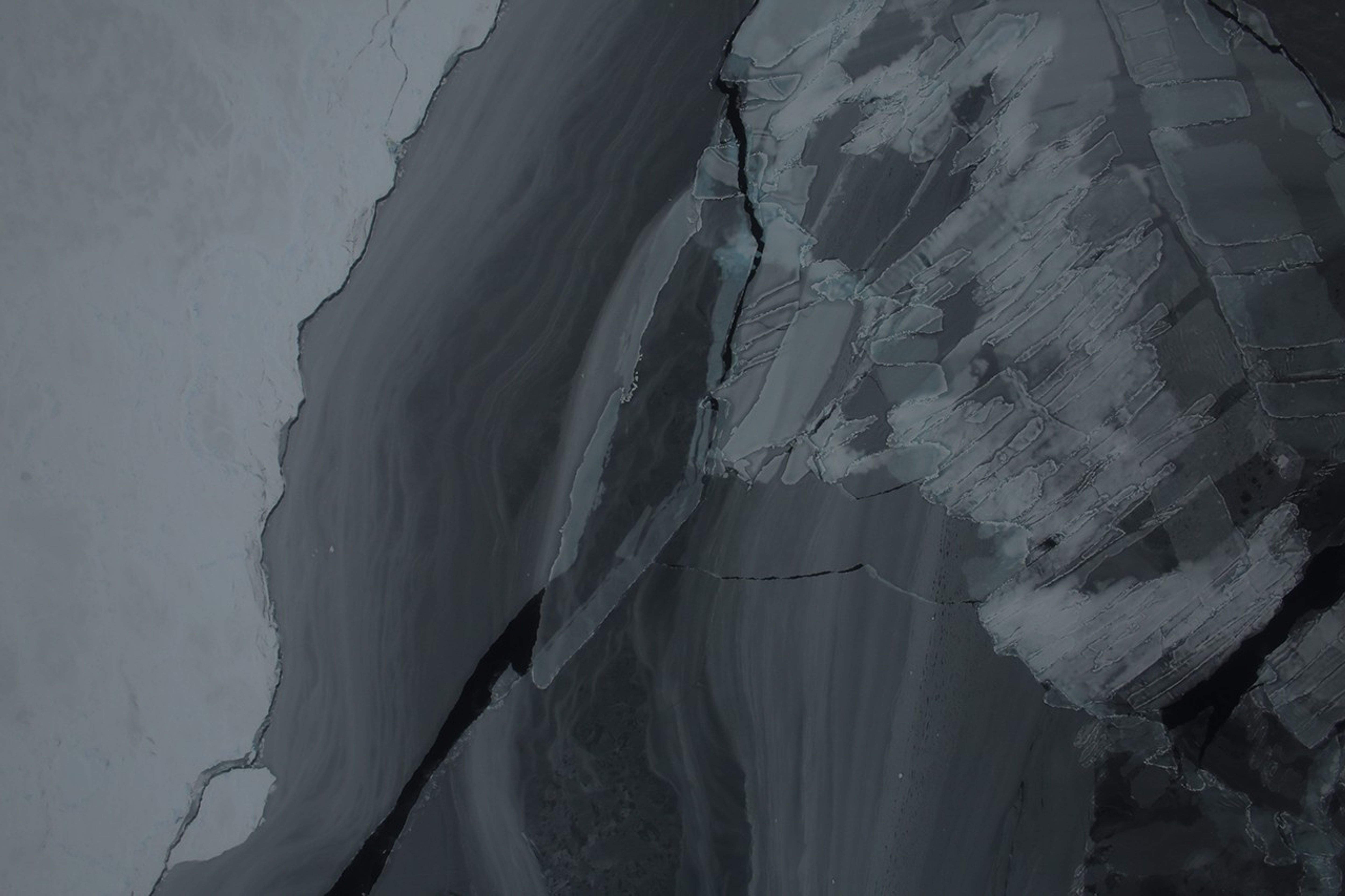 The photograph above was shot on November 14, 2017, from the window of a NASA P-3 research airplane during a flight for Operation IceBridge. The second photograph (below) was captured during the same flight by the Digital Mapping System (DMS). The instrument is essentially a downward-looking camera installed on the belly of the aircraft.