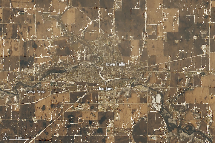The image below, acquired by Landsat on the same date, shows an ice jam in the Iowa River near Iowa Falls. Volunteers came together to build sandbag barriers around wells and other key infrastructure as floodwater and ice chunks as large as dinner tables invaded roads and yards in the town, according to local news reports.