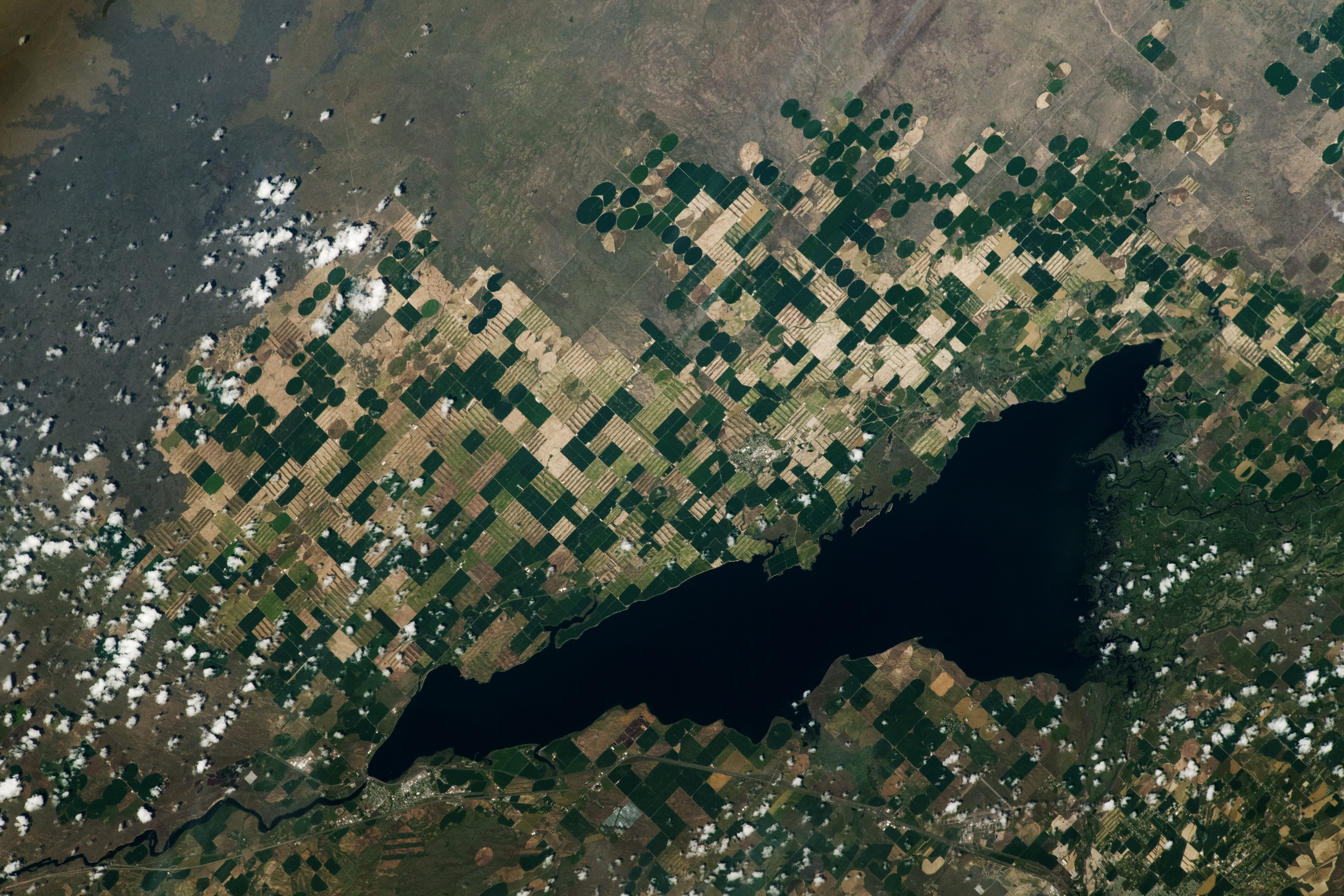 An astronaut on board the International Space Station captured this photo of the Snake River in Idaho, while orbiting over the western United States. The image is centered on the American Falls Reservoir and surrounding agriculture and lava flows. Circular fields appear slightly oblong due to the oblique viewing angle with which the space station crew member captured the photo.