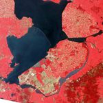 Although the polder’s extent remains consistent, these images show changes in the land cover. Some differences likely result from changes in season. In the image acquired in September 1980, large patches of dark brownish red indicate less robust vegetation, consistent with the onset of autumn. The most conspicuous changes, however, occur in the cultivated area on the polder. In the image acquired in 1980, crops appear as large rectangular blocks. In the succeeding shots, the rectangles have shrunk, suggesting greater diversification. The image from July 2006 shows the brightest shades of red predominating on the polder, which would be expected in the middle of summer growing season.